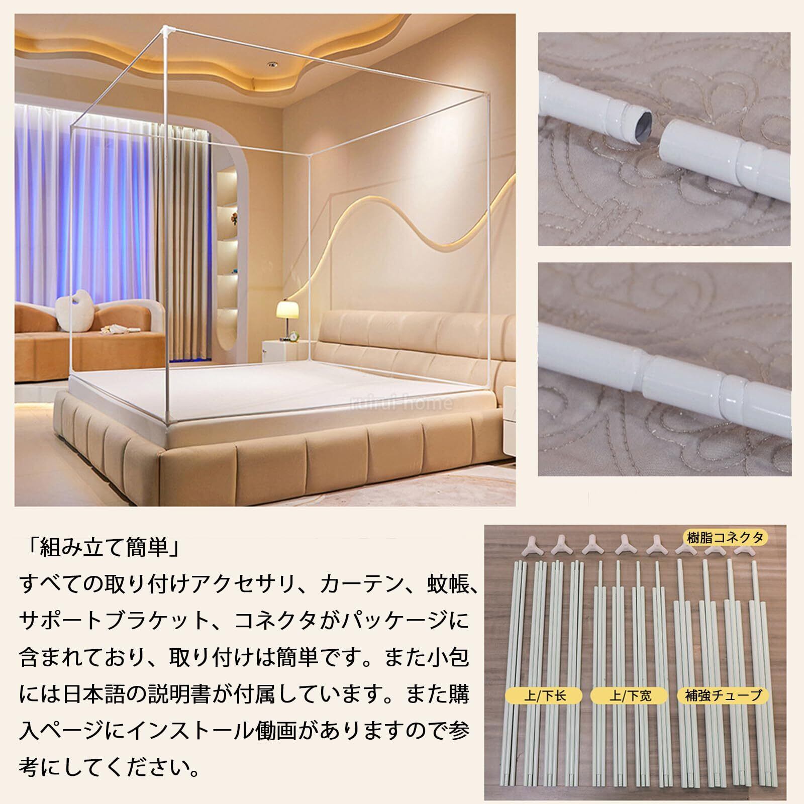 【組み立て簡単、洗濯可能】すべての取り付けアクセサリ、カーテン、蚊帳、サポートブラケット、コネクタがパッケージに含まれており、取り付けは簡単です。また小包には日本語の説明書が付属しています。また購入ページにインストール働画がありますので参考にしてください。