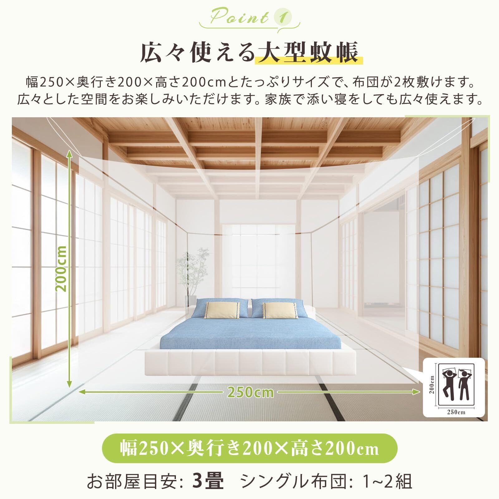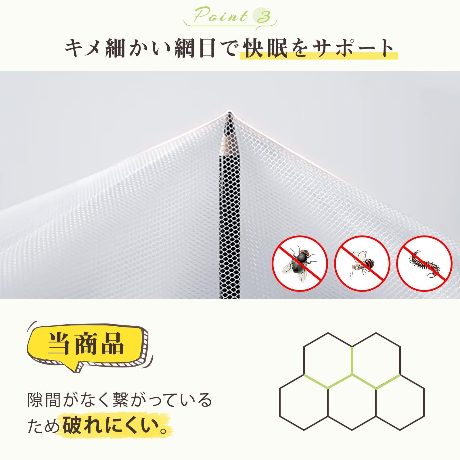 「この蚊帳は高密度のメッシュ生地を使用しており、蚊や虫を効果的にシャットアウトします。通気性も良く、蒸し暑い夏の夜でも快適に過ごせる環境を提供します。子供やペットを持つご家庭でも安心してお使いいただけます。」