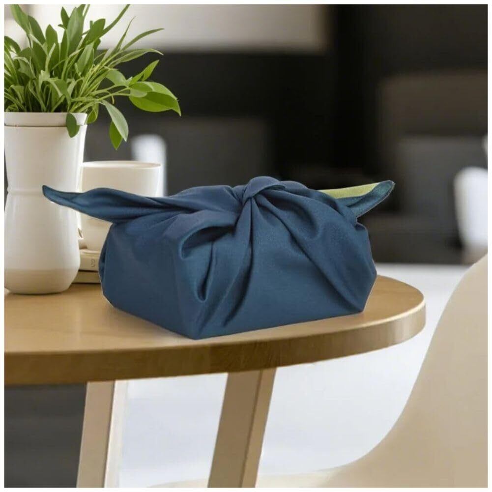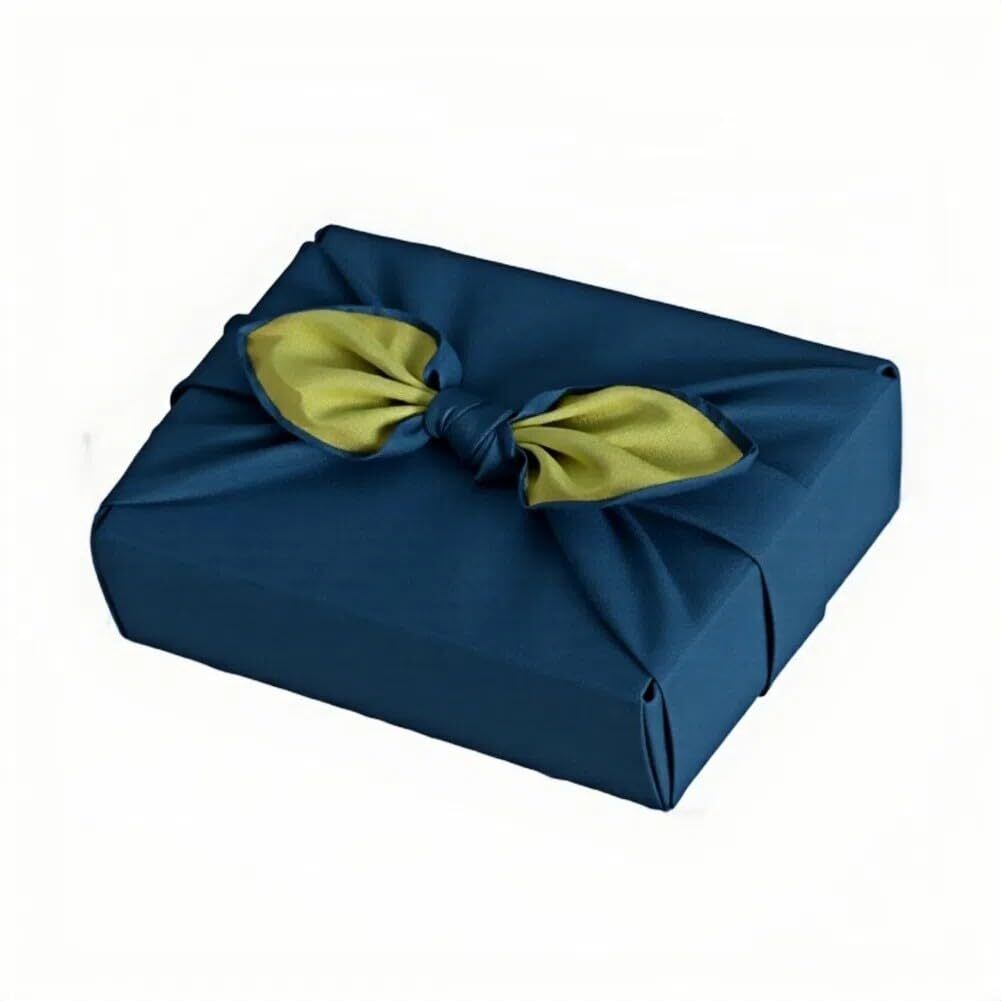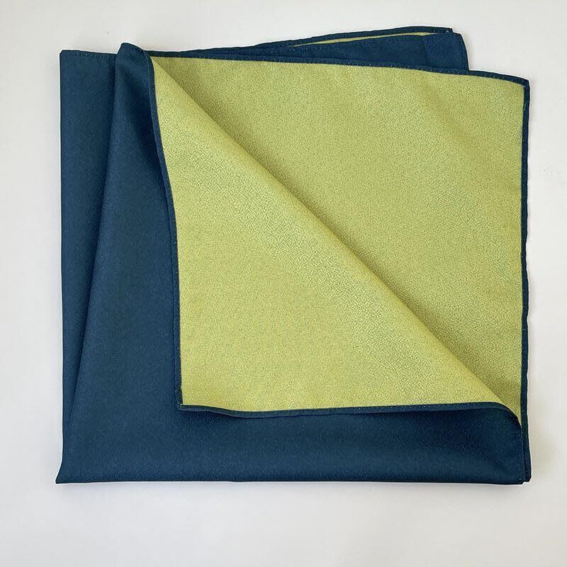 「この風呂敷の最大の魅力は、リバーシブルで楽しめること。紺と緑の落ち着いた色味は、カジュアルからフォーマルまで幅広く対応し、使うたびに異なる印象を楽しめます。使用する場面や気分に合わせて使い分けできるのも嬉しいポイントです。」