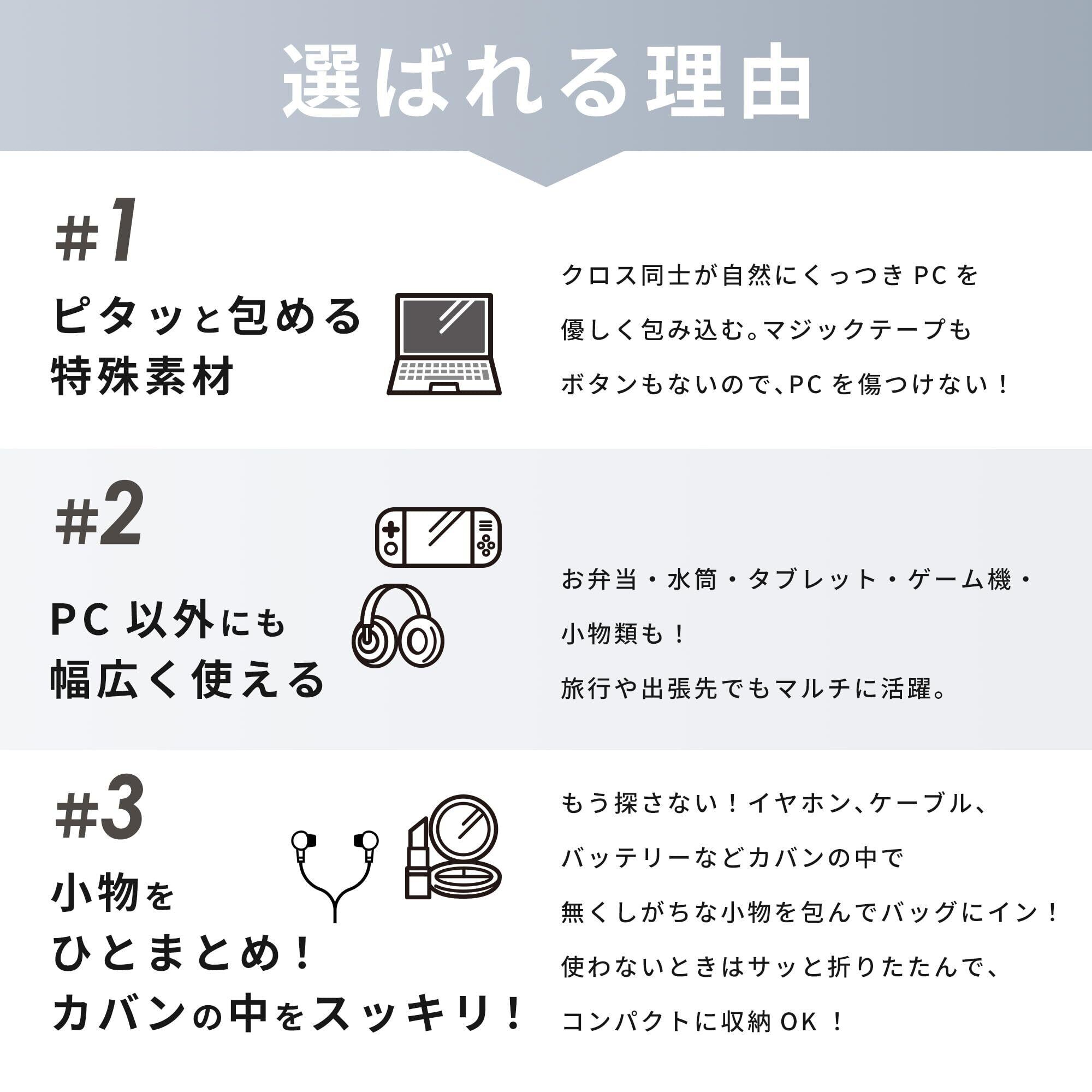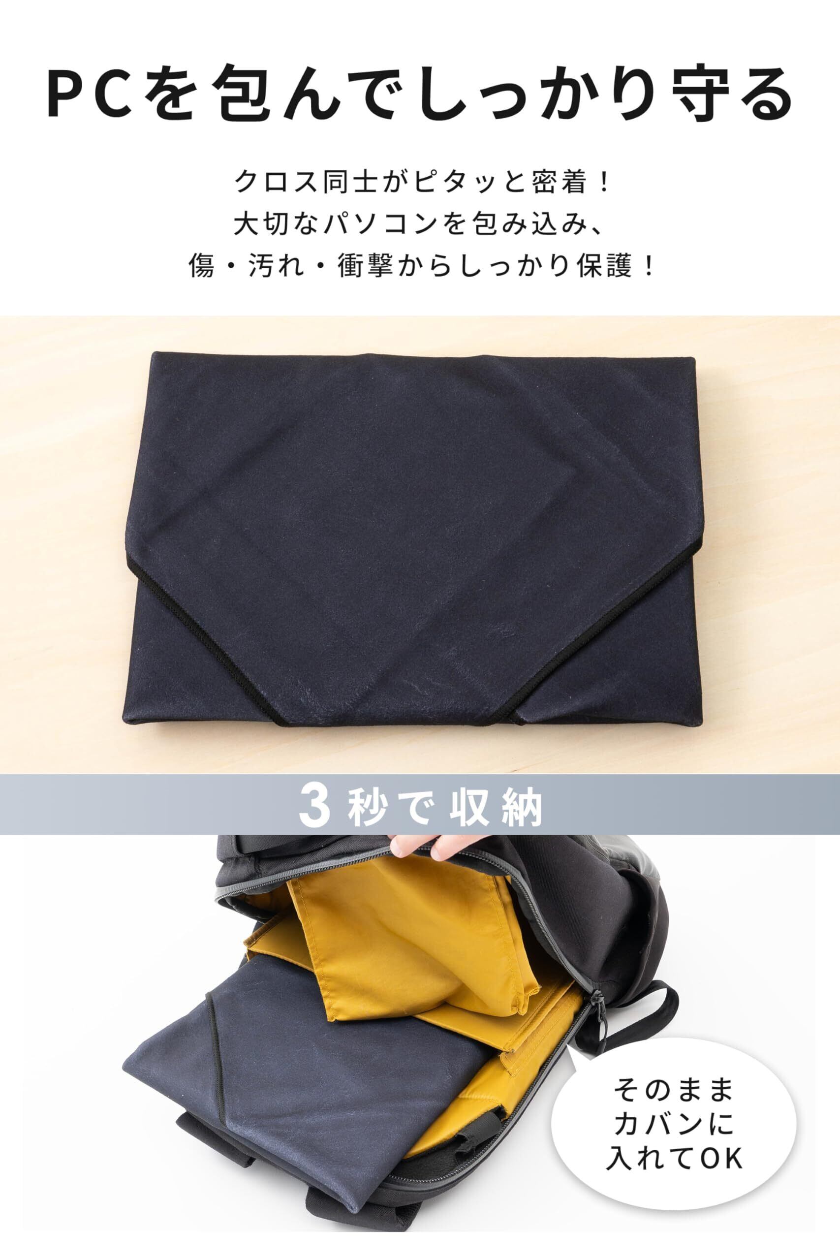 【ノートPC・タブレット・スマホの保護に最適】 ノートPC・タブレット・スマホなどを優しく包み、カバンの中の擦れや衝撃から守ります。サイズを問わずパッと包めて面倒ゼロ!パソコンの持ち歩きにも安心です。