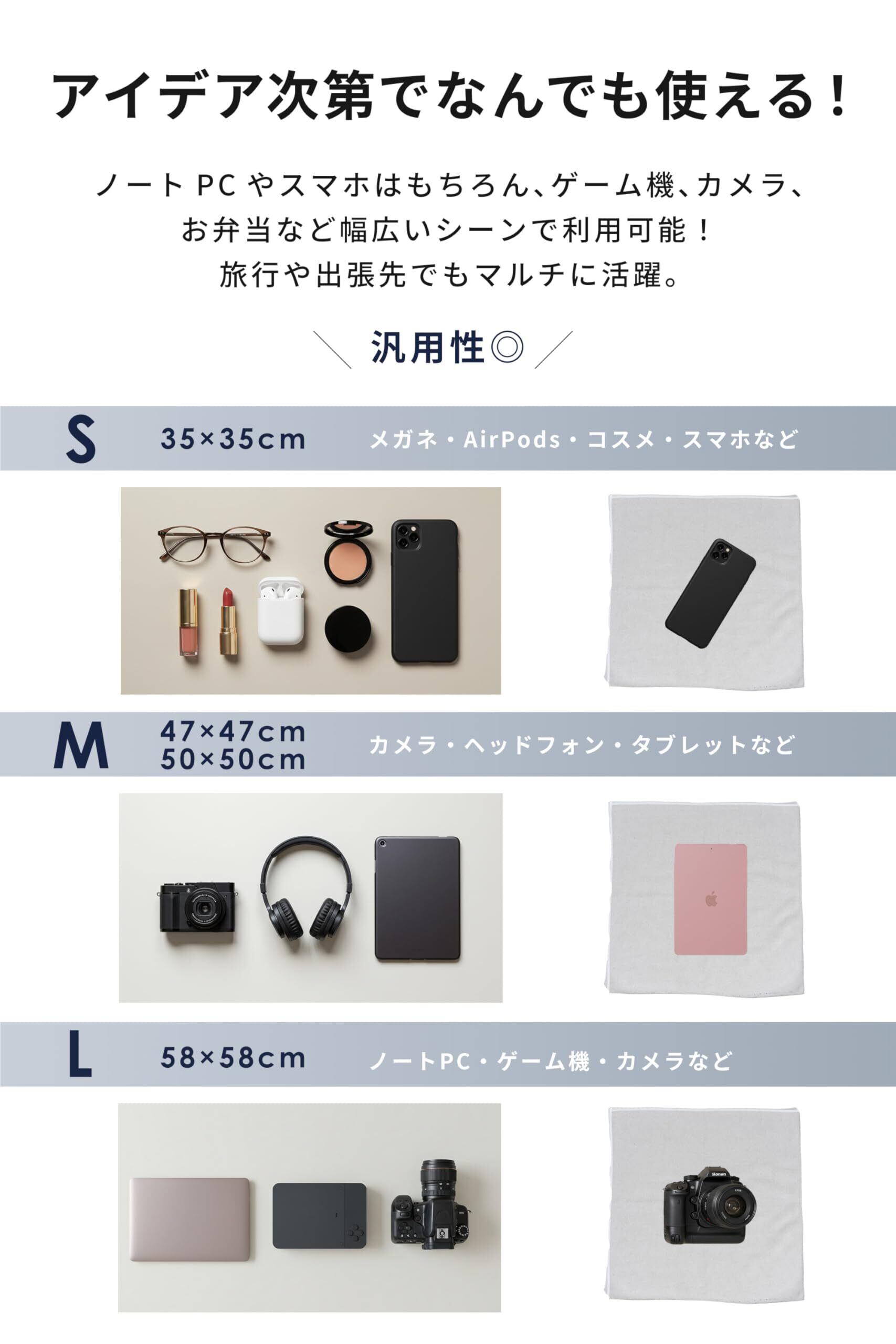 「このクロスは、カメラやノートPCを包むカバーとして、また日常の小物を包むエコ風呂敷としても活躍します。カメラの保護はもちろん、外出先でのピクニックにお弁当を包んだり、ペットボトルを持ち運ぶ際にも大変便利です。」