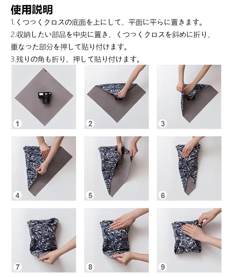 「このタオルは、カメラやiPadを包むだけでなく、化粧品を収納したり、お弁当を包むのにも最適です。通勤や通学、旅行の際に必要なアイテムをしっかりとカバーし、日常生活をより快適にサポートします。」