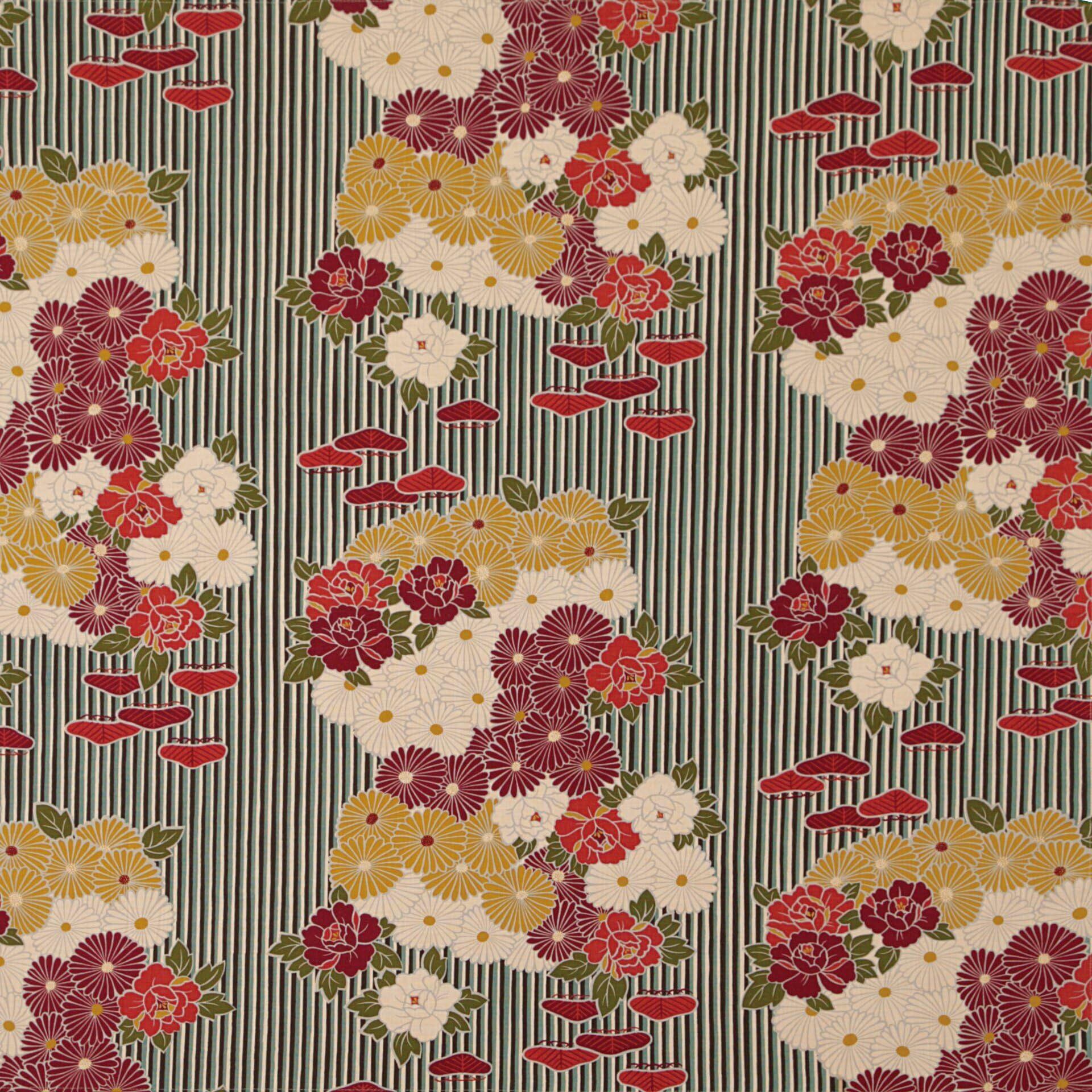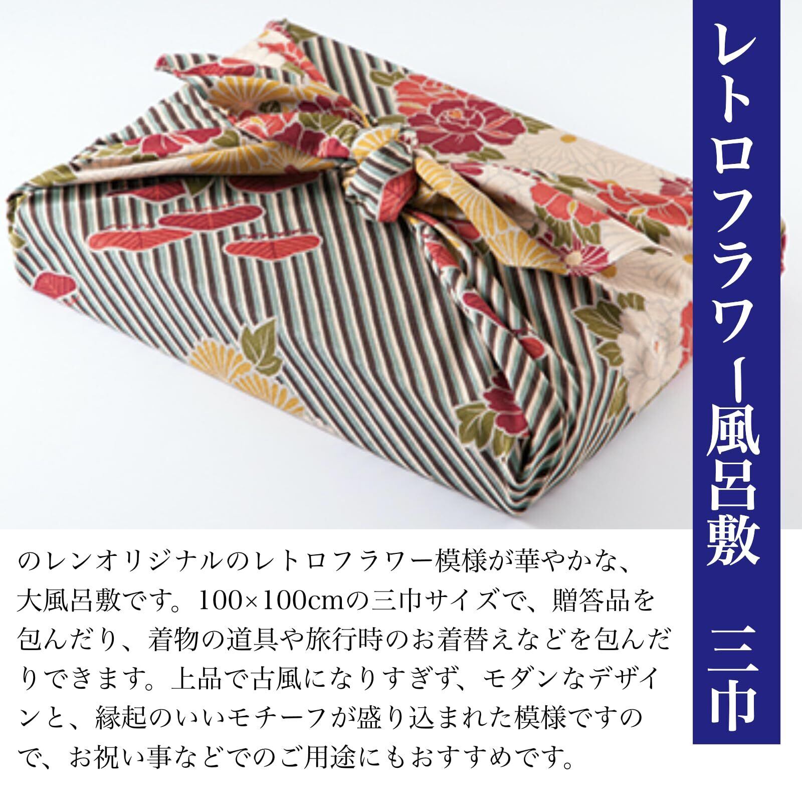 のレンオリジナル レトロフラワーの風呂敷。 のレン人気のオリジナル生地 レトロフラワーが風呂敷になりました。かつお縞に、可憐で優美な菊や牡丹をあしらいました。縁起が良い存在として大切にされた美を組み合わせた織物です。 奈良時代より受け継がれてきた「包む」文化、そしてそのツールである「風呂敷」。 身の回りのいろいろな品を包む融通性に富んだ万能布。風呂敷は、包む、敷く、覆うなど、さまざまな使い方が。 あなたの日常に風呂敷を取り入れてみてはいかがでしょうか。 洗って清潔に使えるエコバッグとして、今注目されています!