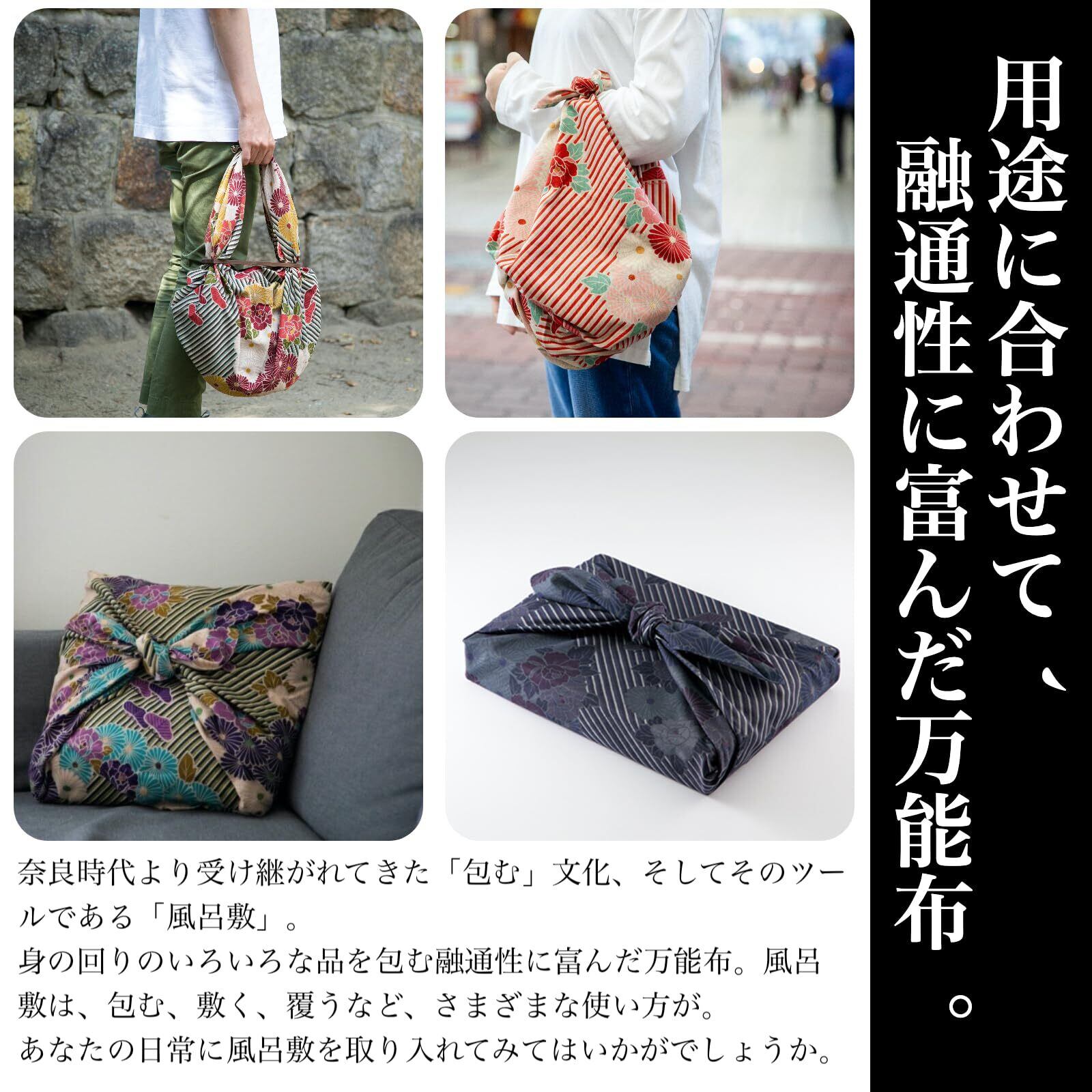 「日本製の高品質な綿素材を使用しているため、手触りがよく、耐久性にも優れています。お洗濯も可能で、色あせることなく長くご愛用いただけます。大切なシーンや日常使いに堅実にお応えする風呂敷です。」
