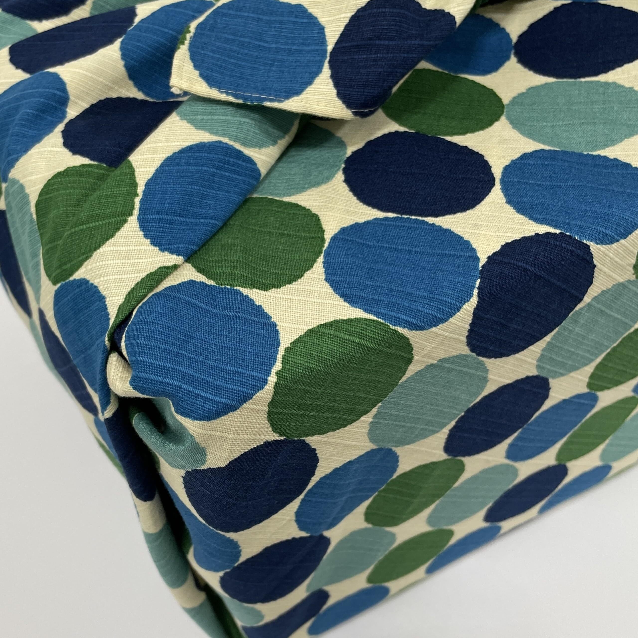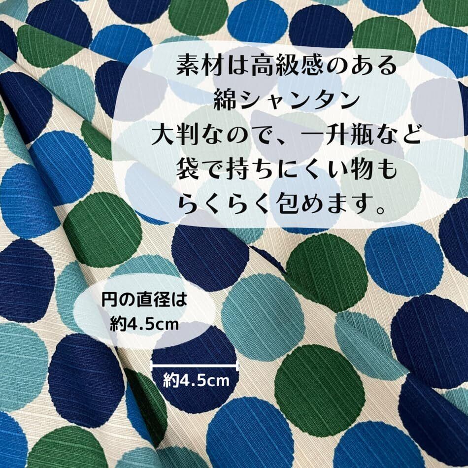 大判風呂敷 サイズ105cm 水玉文様 日本製 高級感のあるシャンタン生地 カラーは爽やかさと懐かしさのある水玉。大判なので100サイズの箱も余裕で包めます。一升瓶や球体のものなど、袋に入れにくいものは風呂敷が便利。防災グッズや旅行の際にもかさばらず利用の幅が広くて便利です。