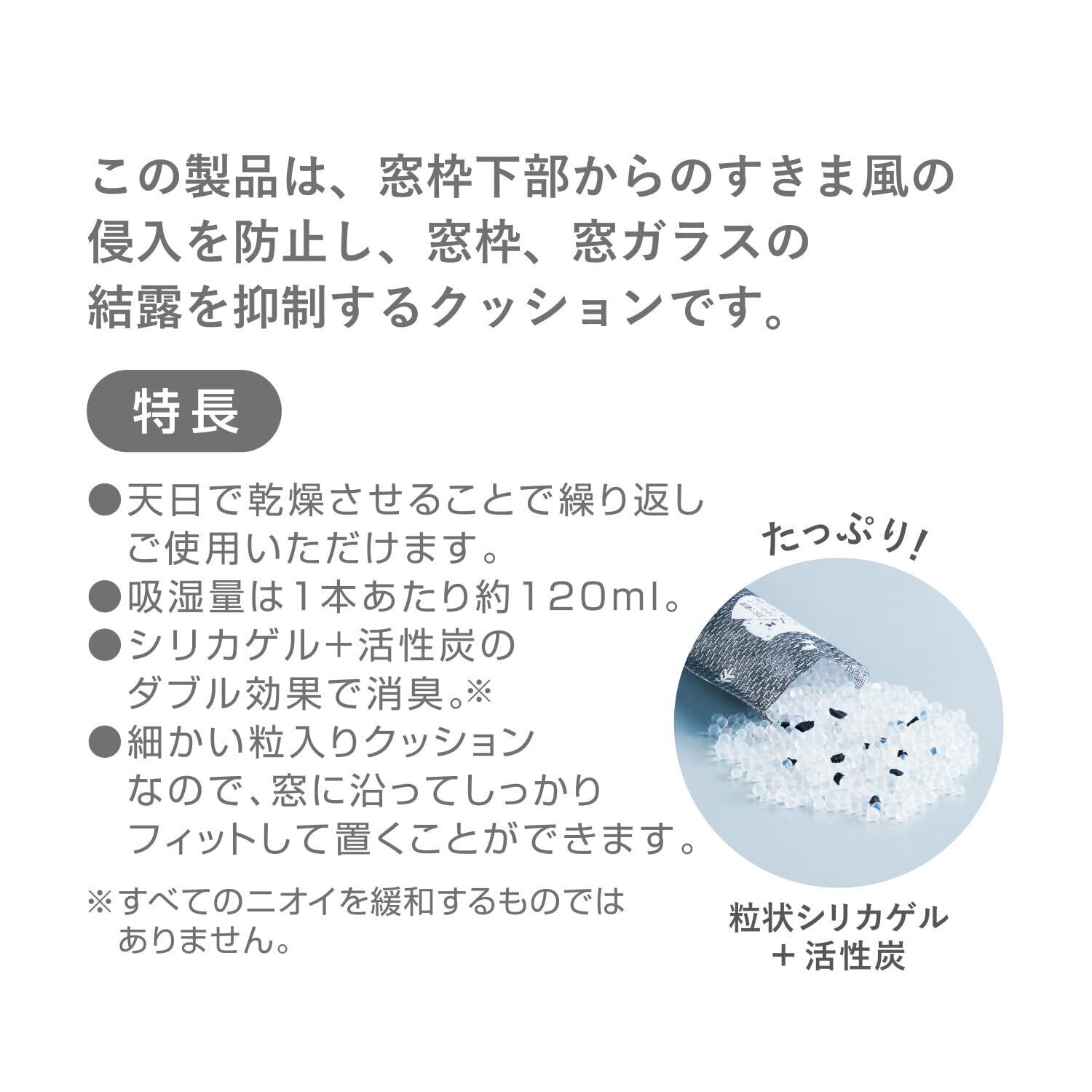 窓の下に置くだけで結露の元となる湿気を吸収。すきま風を防ぐ。天日干しすることで効果が復活。繰り返し使える。折り曲げて小さな窓にもピッタリ。