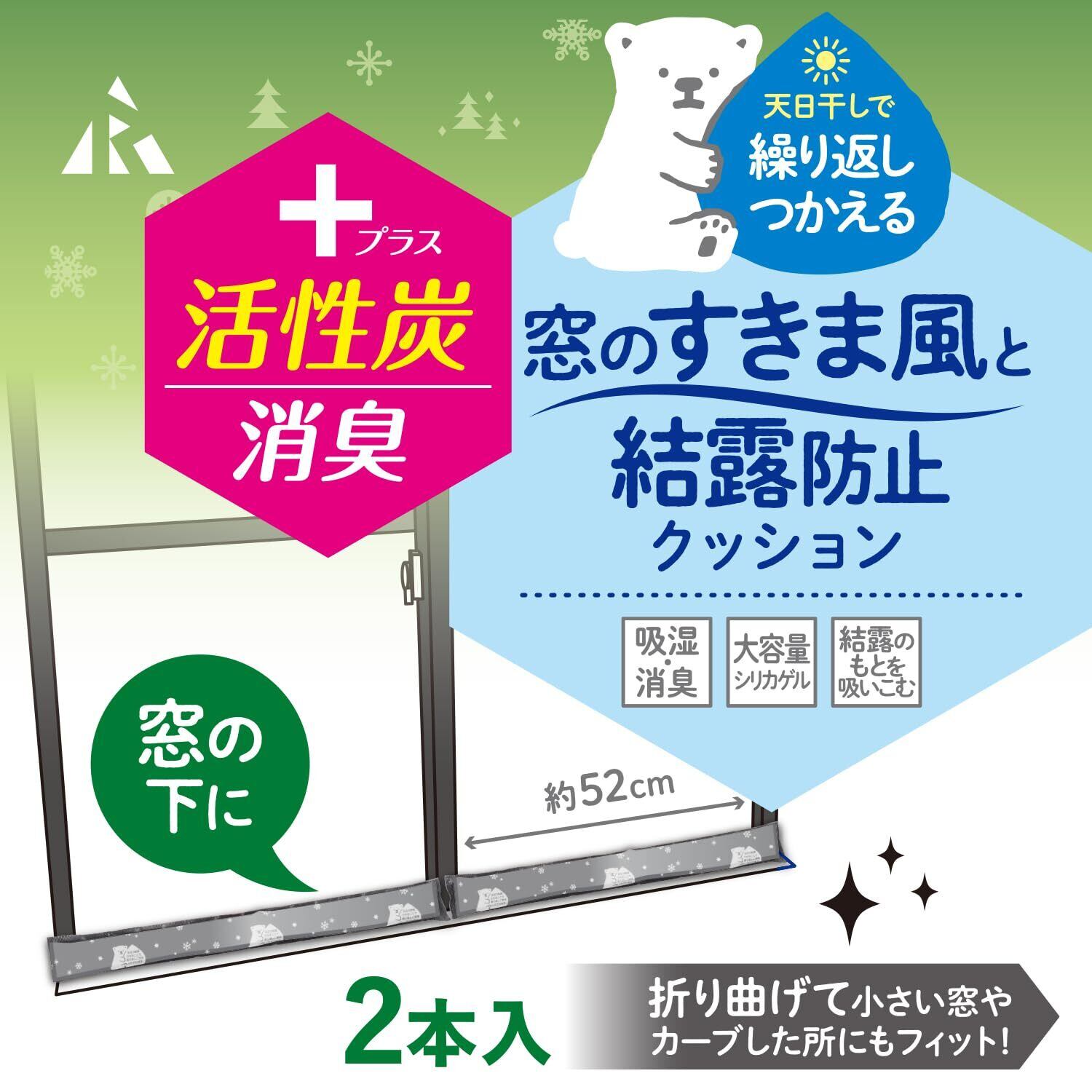 「『アール(R) 消臭すきま風と結露防止クッション』は、シリカゲルと活性炭を使用した新しい発想のクッションです。サイズは52×6×1.5cmで、窓のすきまをしっかりと埋めることができ、外からの冷気や湿気を防ぎます。お部屋の快適さを向上させるための必需品です。」