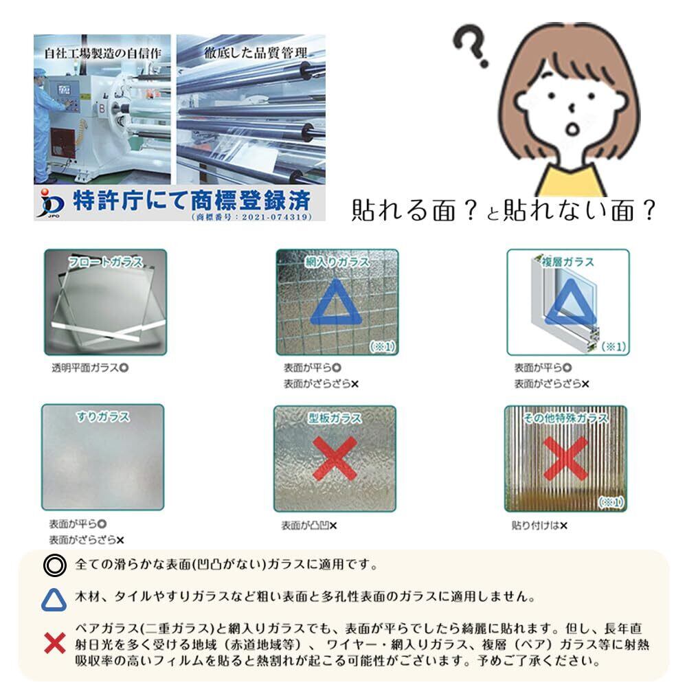【注意】網入りガラスやペアガラス(二重ガラス)でも、表面が平らであれば綺麗に貼ることができます。ただし、網入りガラスや複層ガラスなど一部の特殊ガラスは熱がこもりやすく、高熱を吸収するフィルムを貼ると熱割れが起こる可能性があるため、非推奨です。予めご了承ください。また、保護フィルムをはがす際は、両サイドからゆっくり優しくはがし、平らな状態を保ちながら操作してください。