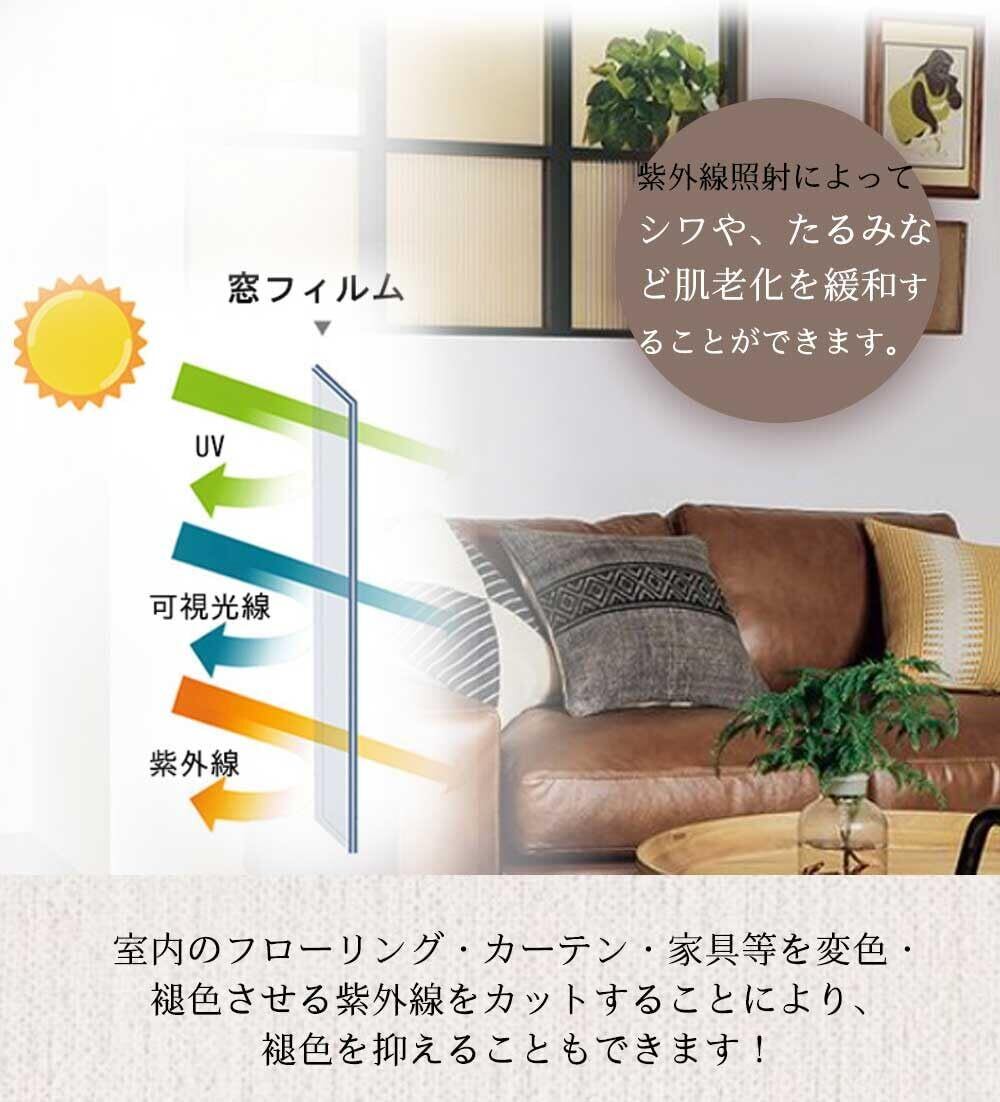 【UVカット・日焼け防止】UVA84%・UVB99%以上の紫外線をカットし、肌トラブルや日焼けを防止します。長時間日差しが差し込む南向きのリビングや窓際で過ごすデスク周りなど、日差し対策が必要な環境でも快適に使用できます。家具やカーテンの色あせ防止にも役立ち、一年を通して快適な空間を維持できます。
