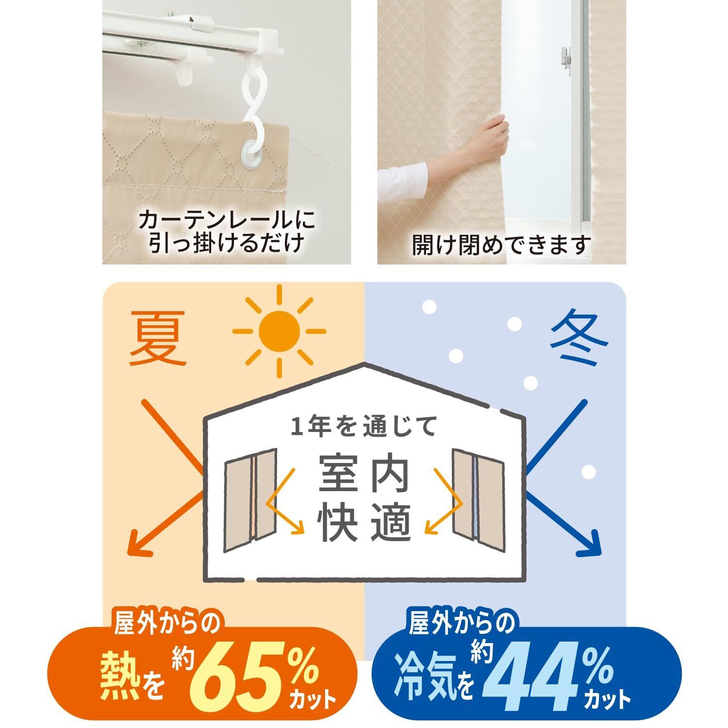 柔らか素材で開閉もしやすく、1年を通して冷房・暖房効率UPで省エネ。夏は太陽光の輻射熱(赤外線等)を反射し、冷房効率がUP!冬はアルミ蒸着が暖房器具からの輻射熱を室内に反射し、室内温度の低下を抑制します。