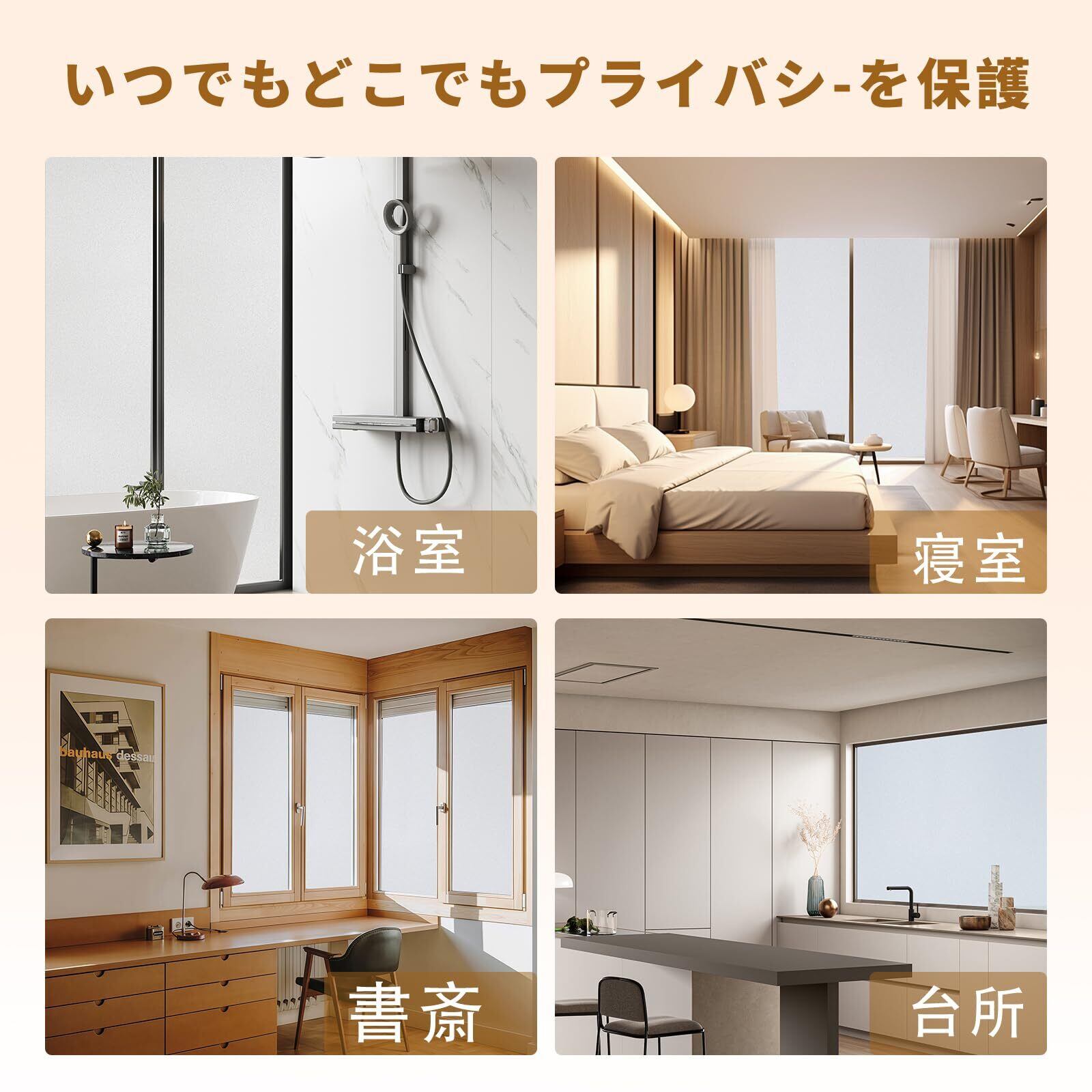 「『窓用ガラスフィルム すりガラス調』は、浴室、玄関など様々な場所で利用できる目隠しフィルムです。サイズは30×200cmで、必要に応じてカットが実施可能。すりガラス調のデザインがプライバシーを保ちながら、柔らかな光を室内に取り入れます。」