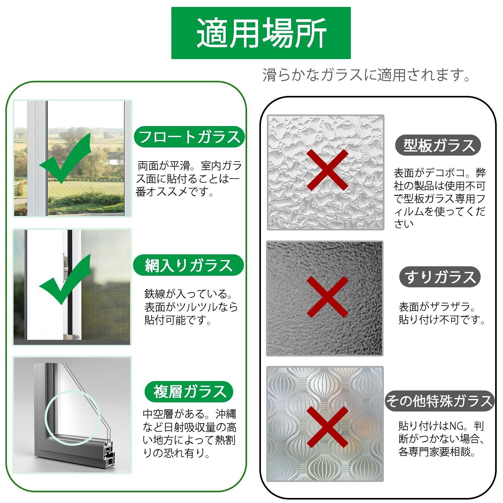 【適用範囲】平滑で平らなガラスに適しています。すりガラス、曲面ガラス、凹凸のあり、平らでないガラスには使えません。すりガラス フィルム ごオフィスのガラス、家庭の窓、ガラス引き戸、フランス窓などに幅広く適しています、 寝室、リビングルーム、ダイニングルーム、オフィス、ホテル、教室、ロビーなどに幅広くご使用いただけます。● ご使用上の注意:室内から貼るタイプです。外側に貼り付けると使用寿命が大幅に減少し、窓ガラス面から落ちる恐れがあります