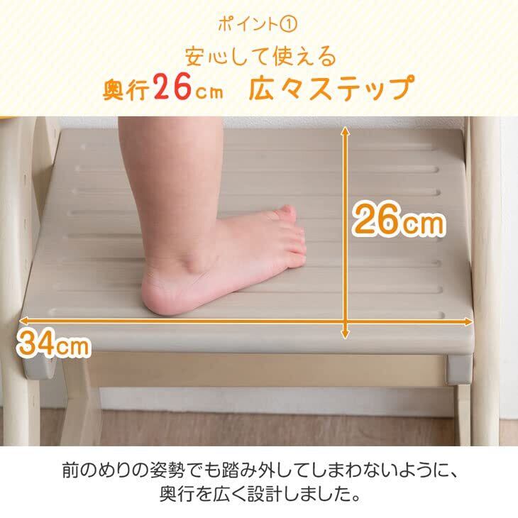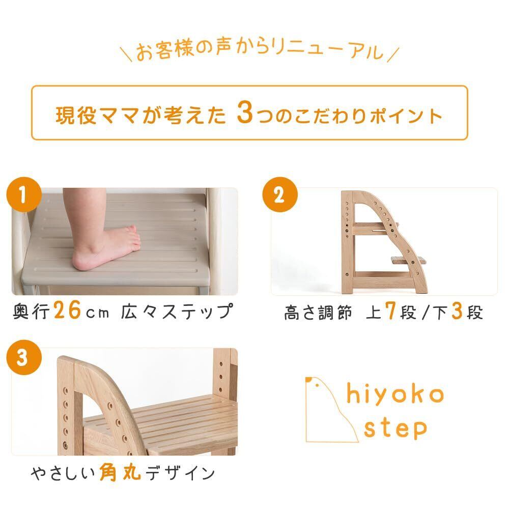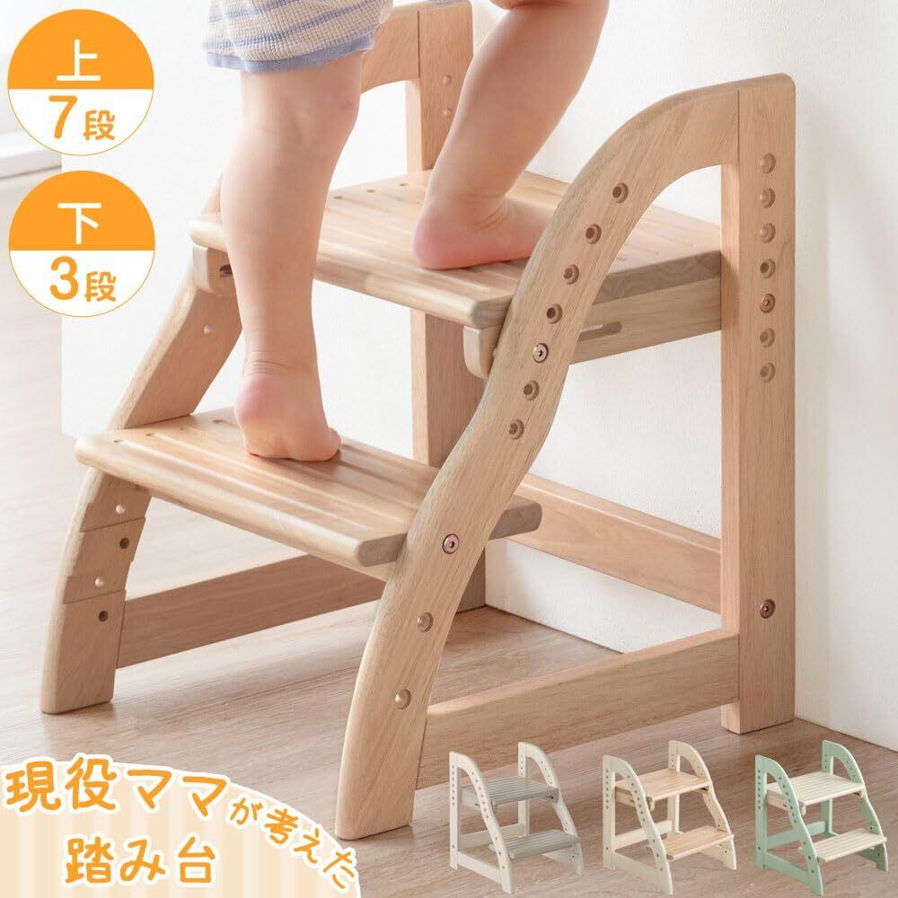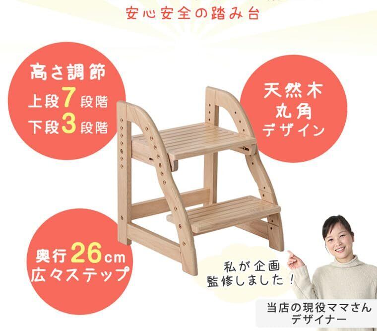【スタッフのおすすめポイント】・現役ママが考えた踏み台 より登り降りしやすくリニューアル 成長に合わせて使いやすい高さに調節! 【上段:7段階 下段:3段階】 滑り止め付きステップ! ・角に丸みをつけた安心設計 ・あたたかみのある天然木使用 ・大人も乗れる耐荷重80kg