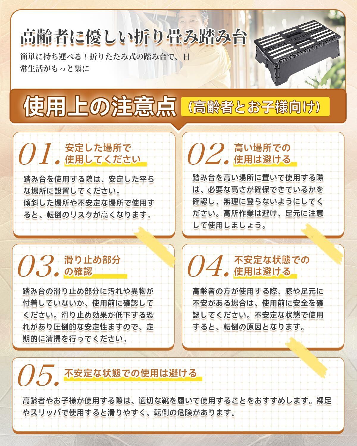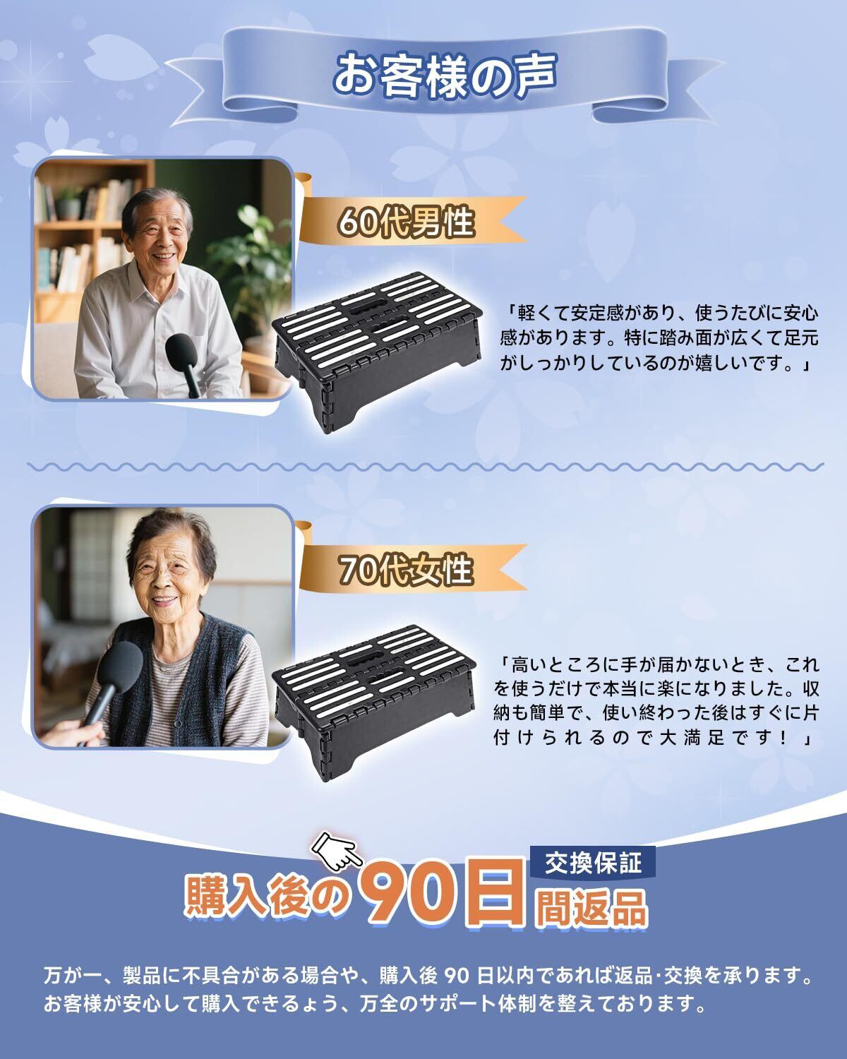 「踏み台表面には滑り止め加工が施されており、しっかりとした接地感を提供します。安心して昇り降りできるので、高い場所へのアクセスも容易です。信頼性の高い素材で作られているため、長期間使用しても安心です。」
