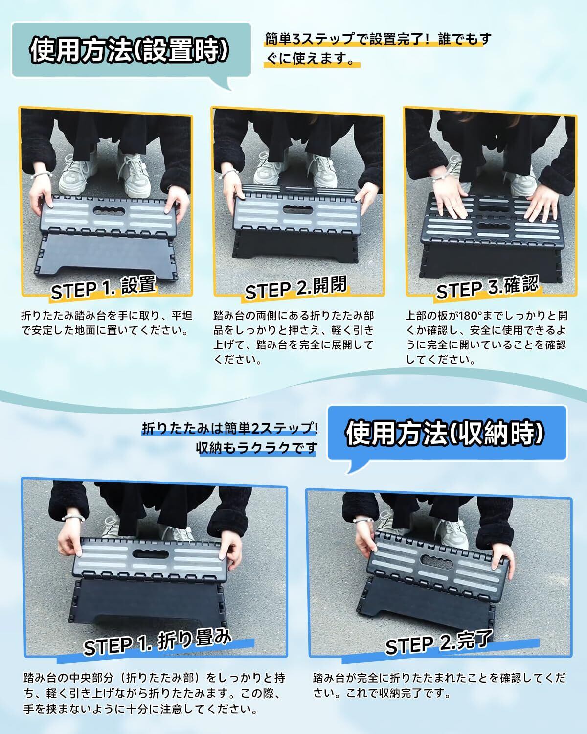 「この踏み台は、折り畳むと薄型になるため、収納スペースを選びません。車のトランクにもスッキリ収まるので、いつでも持ち運びが可能です。洗車や家具の移動、子供を助けるための補助としても幅広く使えます!」