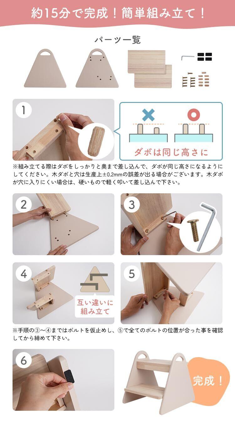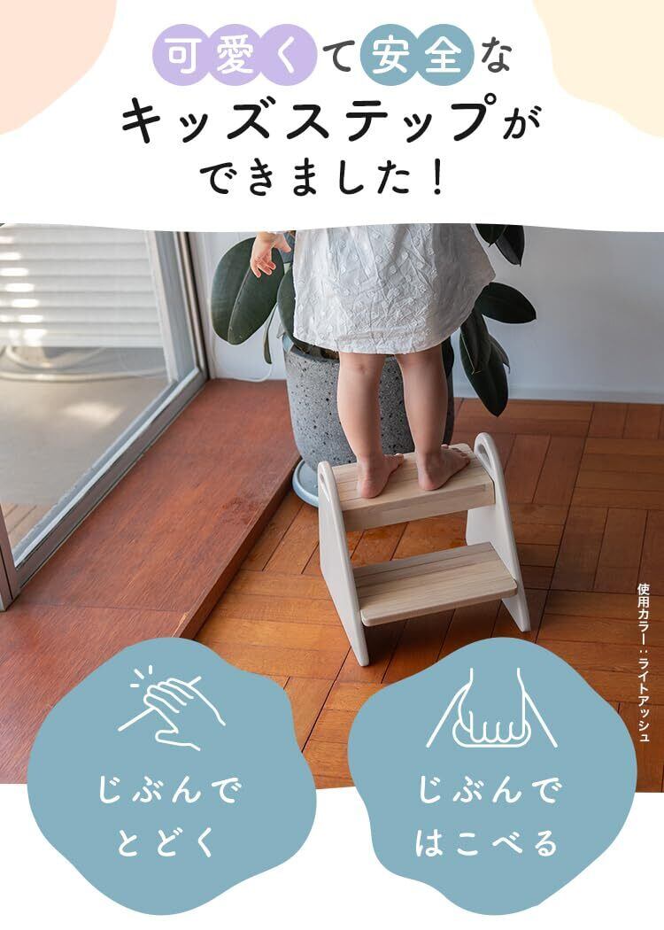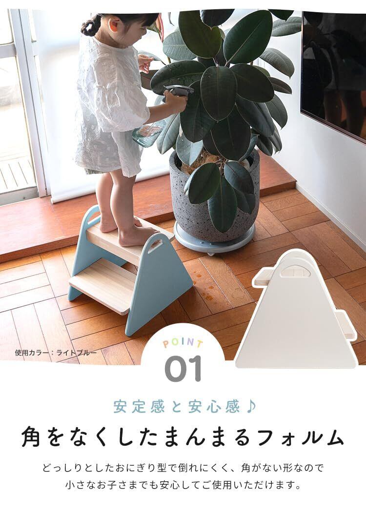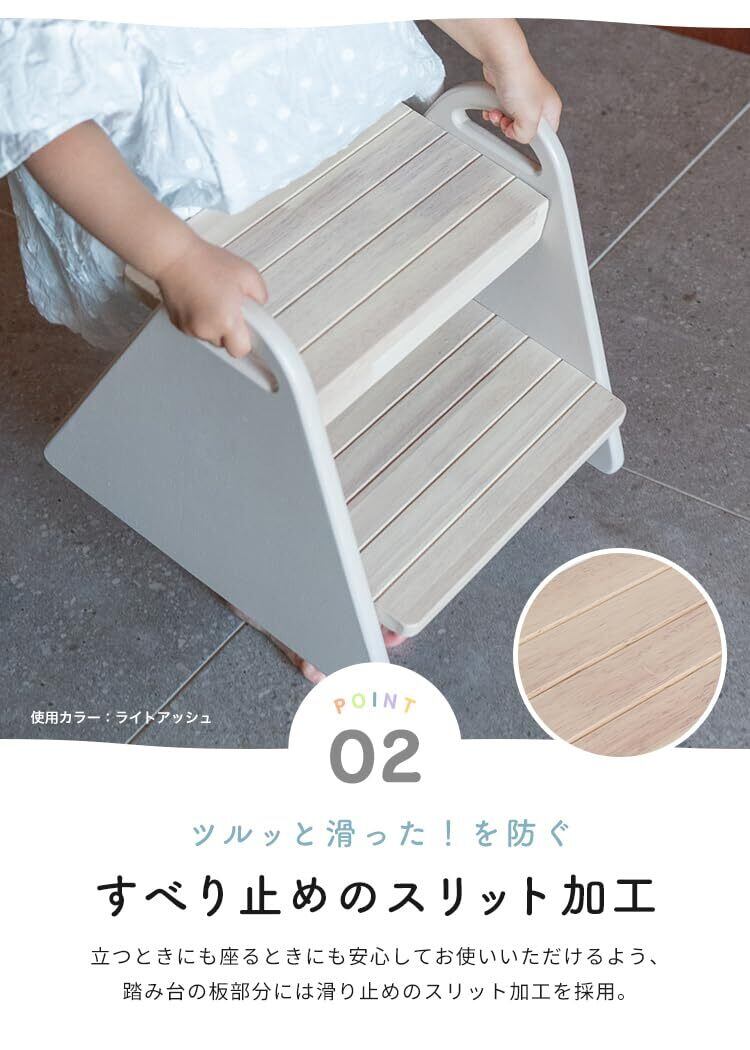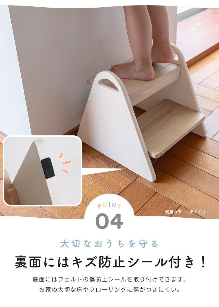 「踏み台の表面は滑り止め加工が施されており、安心してご使用いただけます。また、キズ防止の工夫が施されているため、長期間ご利用いただける設計です。お子様の生活をサポートし、より自信を持って行動できるようになるでしょう。」