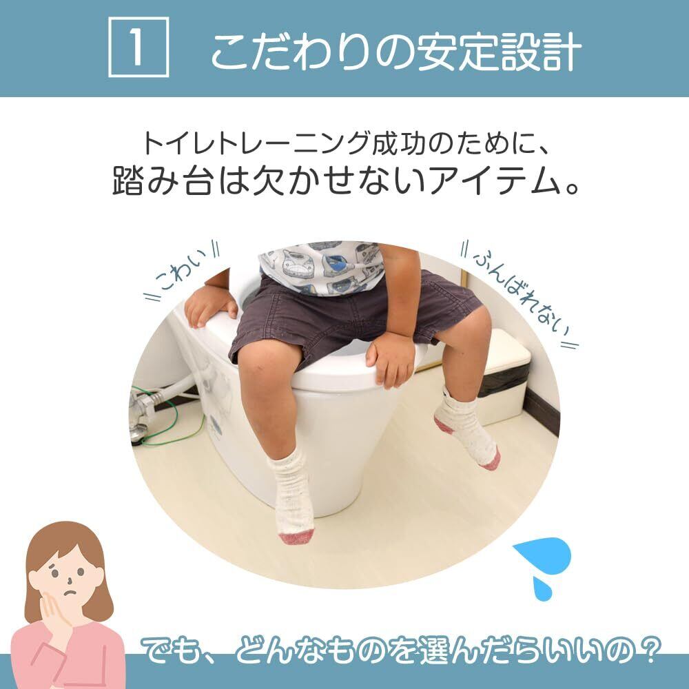 「踏み台の表面には滑り止め加工が施されており、上り下り時の安定感を提供します。お子様が使う際にも安心で、転倒の心配が少なく、安全にお使いいただけます。これにより、自立した行動を促し、トイレトレーニングを楽しいものにします。」
