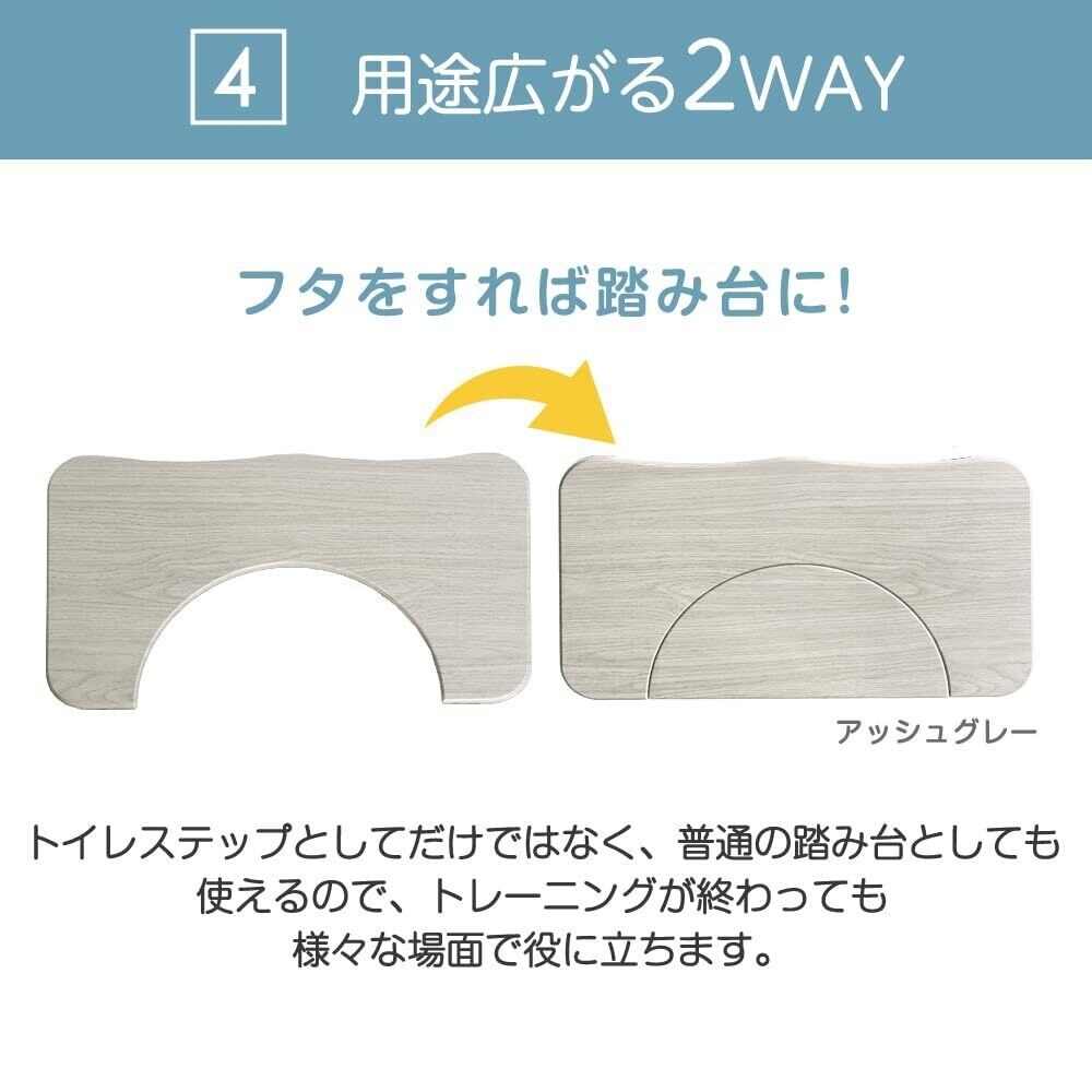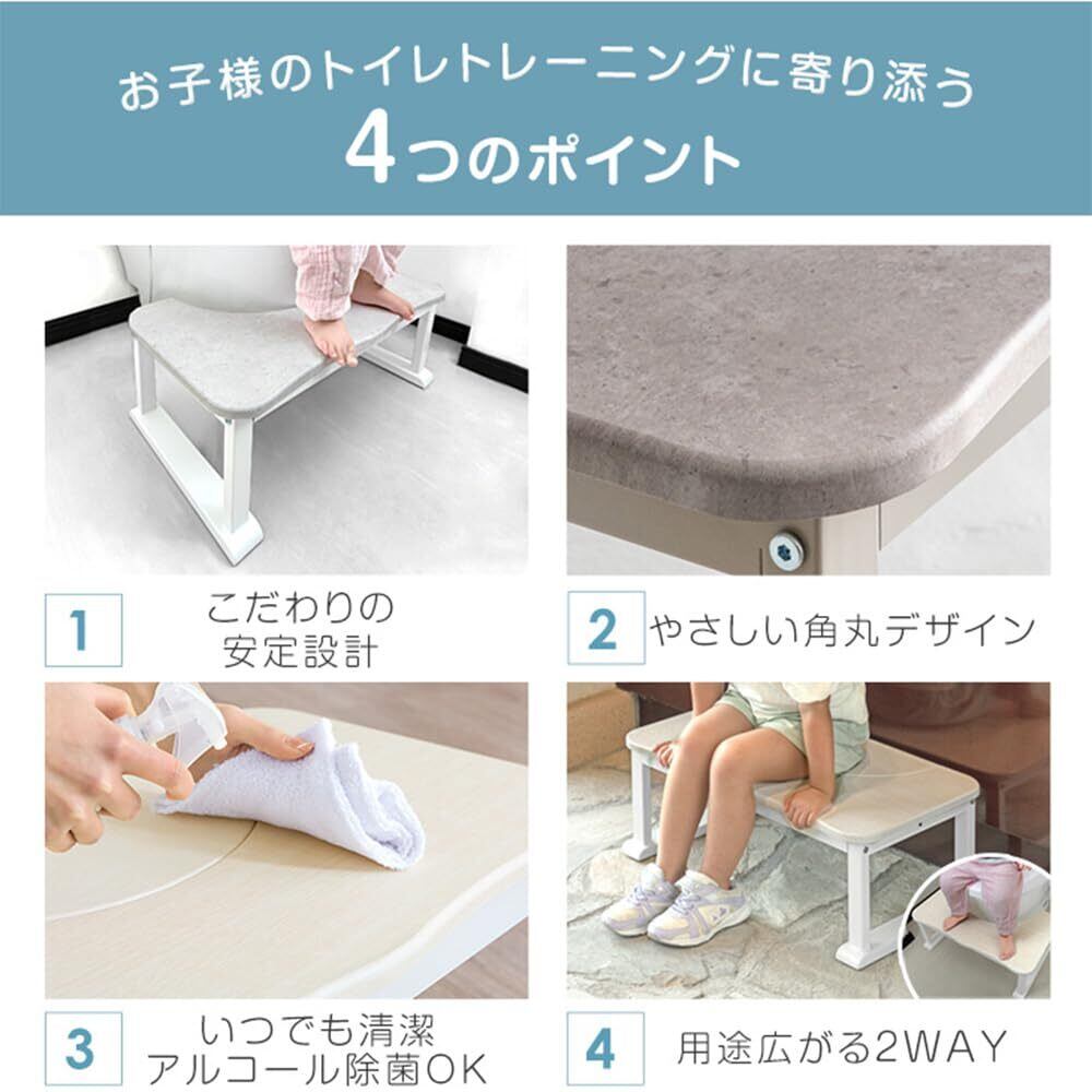 「『タンスのゲン トイレ 踏み台 2WAY』は、トイレトレーニングをサポートするために設計された高機能な踏み台です。耐荷重200kgを誇り、頑丈な作りで安心して使用することができます。アッシュグレーの木目調デザインは、インテリアにもなじむおしゃれなアイテムです!」