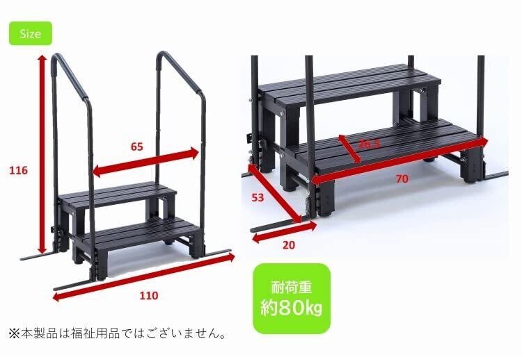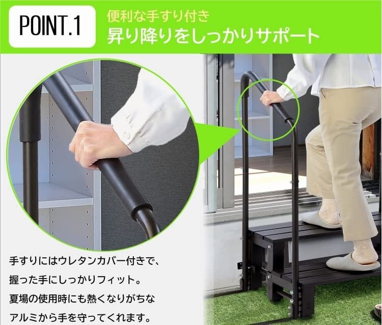 ●気になるちょっとした怖い段差を解消してくれるステップ台に手すりがついてさらに便利に! ●手すりが付いているから昇り降りする時のちょっとした不安を解消してくれます。●足元にはアジャスターが付いているので土の上などの地面の高さにバラつきがあるところでも設置しやすい。●アルミ製だから軽量で汚れにも強いから、お好きな場所に設置する時に楽々●片手すりのタイプと両手すりのタイプがあるからお好きな方からお選びいただけます。