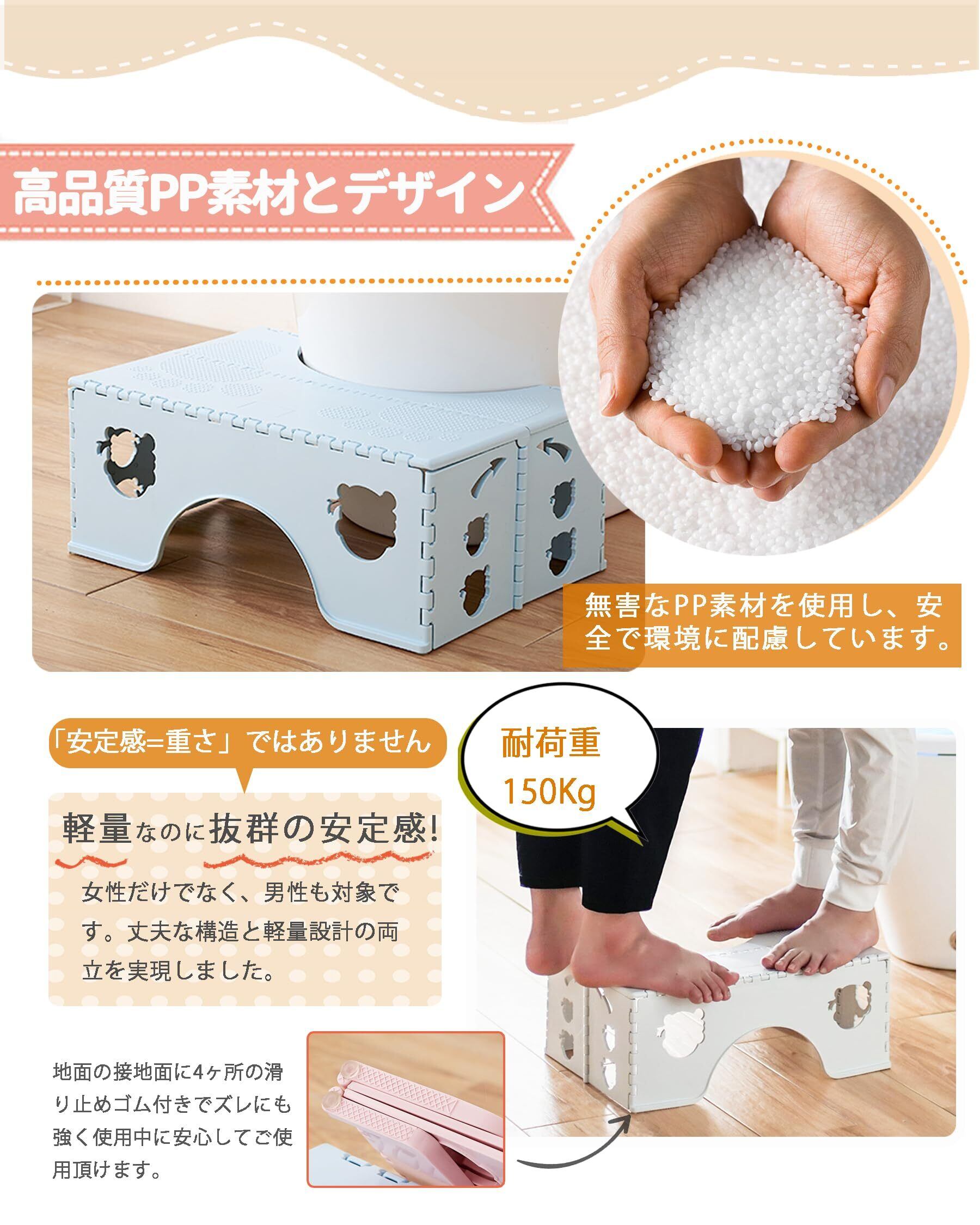 【折りたたみ式踏み台】一般的なトイレの踏み台とは異なり、踏み台の側面を軽く押すだけで簡単に折りたため、コンパクトに収納できるので、トイレ内のスペースを有効活用できます。折りたたみ式で、持ち運びに便利です。【スタイリッシュでシンプルなデザイン】シンプルでありながら存在感のあるデザインは、リビングやトイレなどでもスタイリッシュに演出できます! 可愛らしい淡い色を使用しているので、お部屋のインテリアを損ねる心配もありません。【強さと軽さを兼ね備えた踏み台】わずか1400gのトイレ踏み台です。一方で耐荷重は150Kgと、お子様だけでなく、お母様やお父様もお使いいただけるので、様々な用途で活用できます!