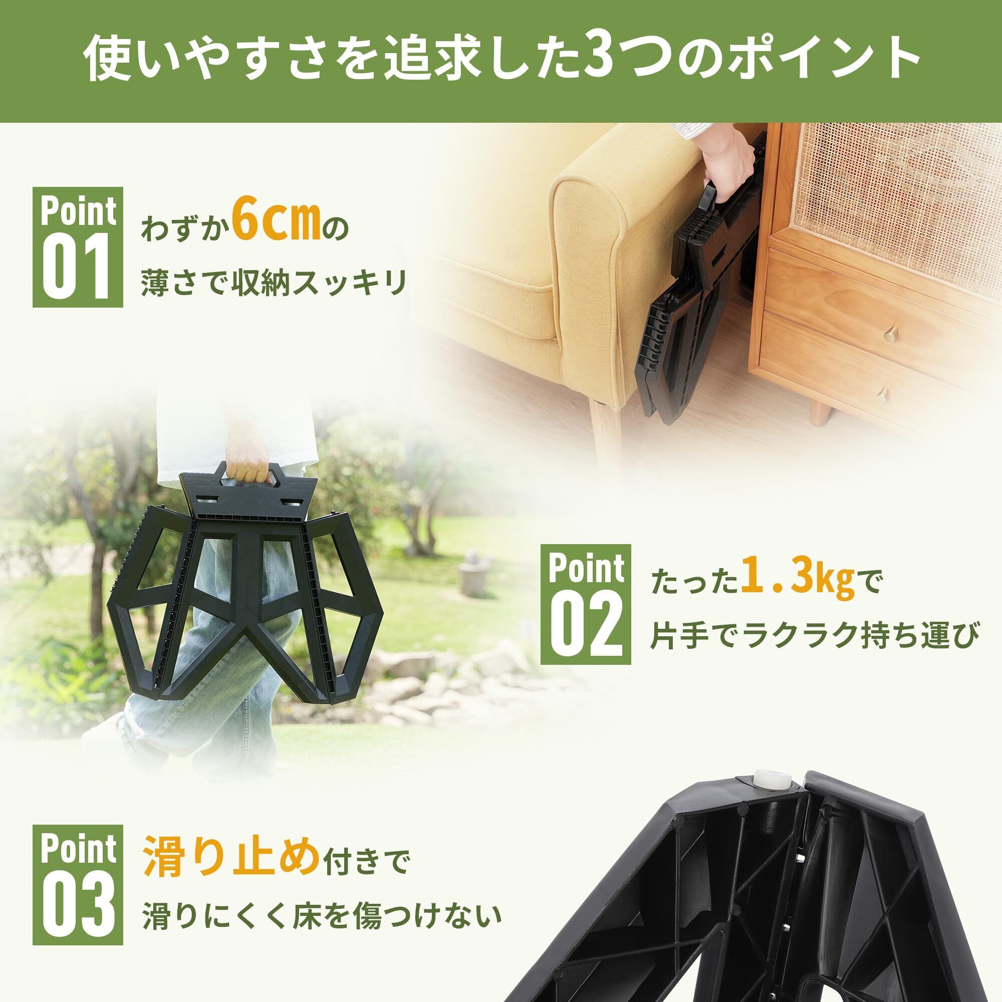 「踏み台としてだけでなく、スツールとしても利用できます。作業台や休憩所としても役立つため、大人から子供まで幅広い用途に対応可能です。特にキャンプや庭作業などのアウトドアで、様々なシーンで活躍する一品です!」