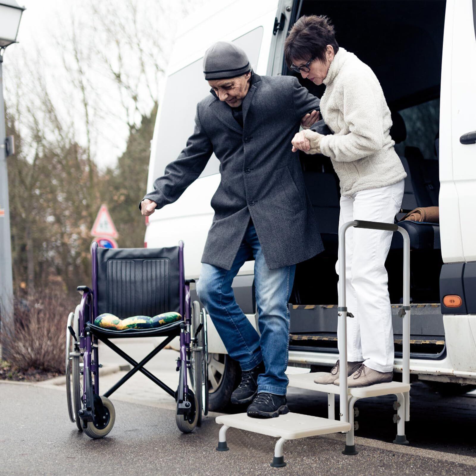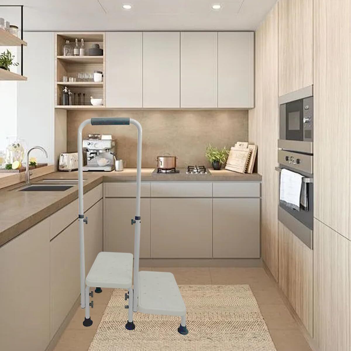 「この踏み台は、しっかりとした手すりが付いているため、高い場所へアクセスする際も安心です。特にお年寄りや小さなお子様が使用する際には、しっかりとしたサポートがあることで、転倒のリスクを軽減します。また、軽量設計により持ち運びも楽々です!」