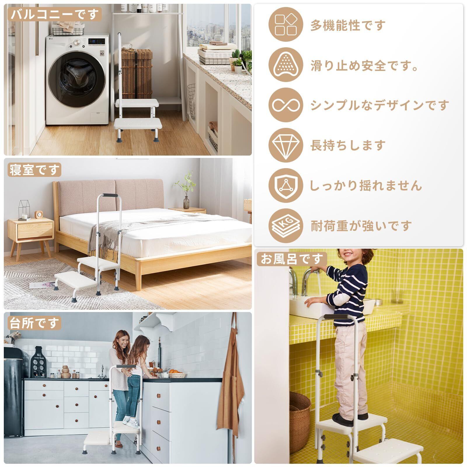 「踏み台は、使用時の用途に応じて高さを調整できる設計です。これにより、お風呂や洗面所、あるいは高い棚の物を取り出す際など、多様な場面で活躍します。高さを変えることで、使いやすさが向上し、作業の幅を広げます。」