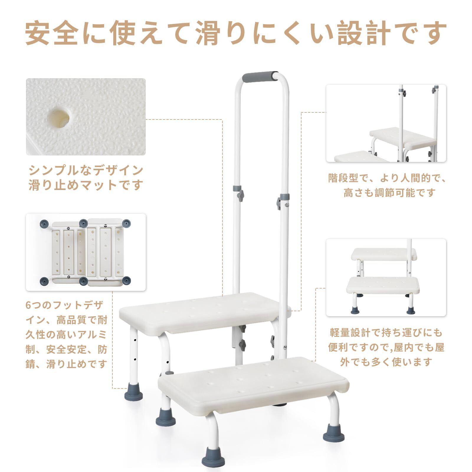 「『踏み台 手すり付き ステップ SKC03』は、高さ調整が可能な手すり付きの踏み台です。滑り止め機能を備え、安定した使用感を実現しています。お年寄りやお子様の安全を考慮した設計で、玄関や浴室、キッチン、リビングルームなど、さまざまなシーンでご利用いただけます!」