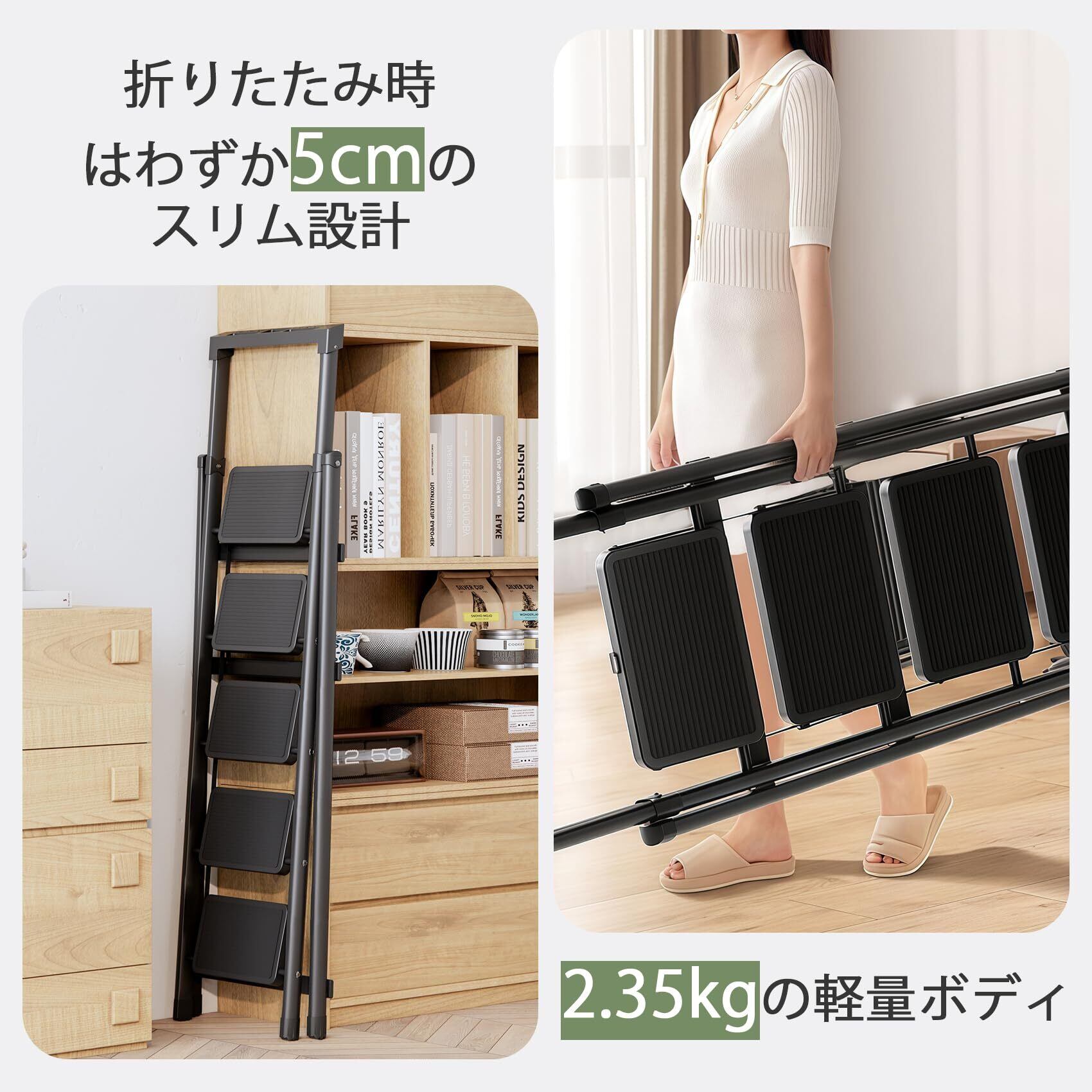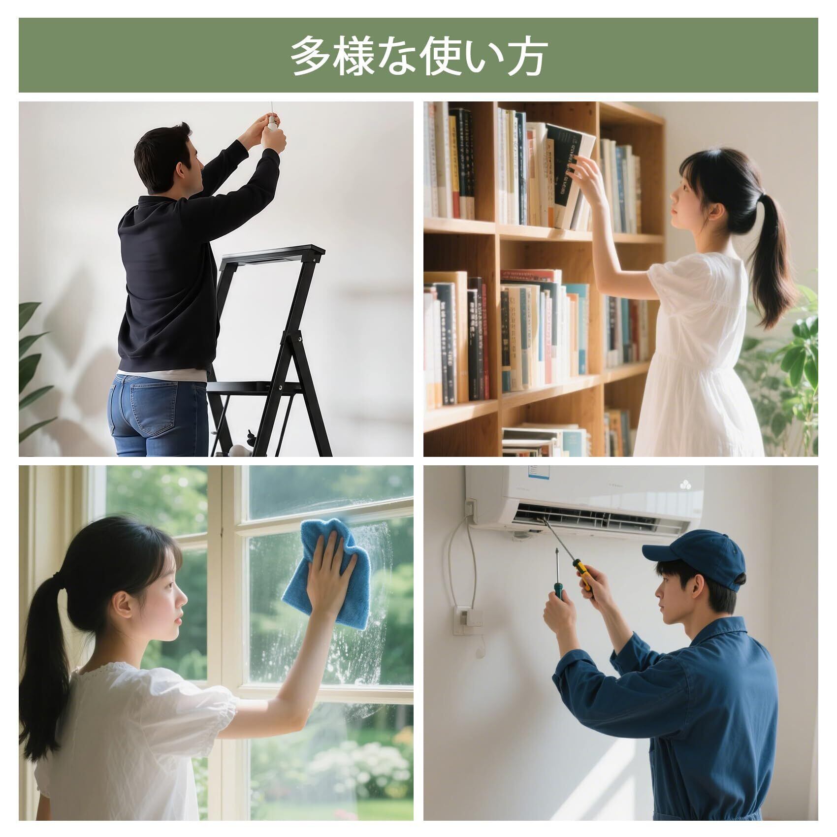 「この脚立は、家庭内の様々なシーンで活躍します。洗車や電球交換のほか、キッチンやバスルームでの高所作業にも最適です。これ一つで家中の作業をしっかりサポートし、快適な生活を実現します。」