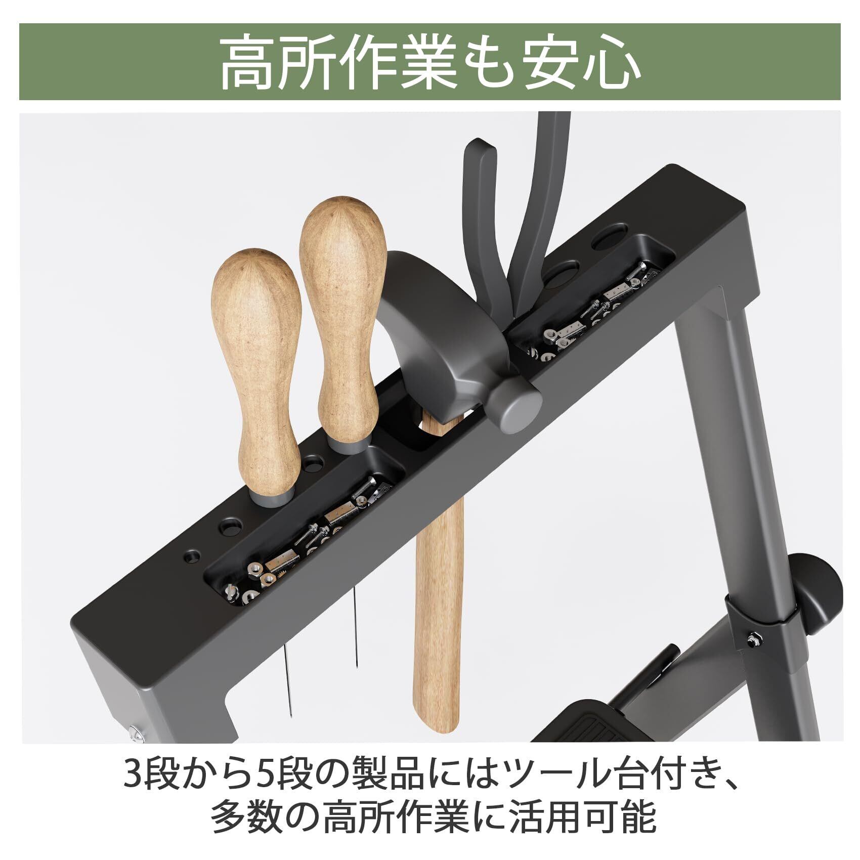 「この脚立は、手すりが付いているため、昇降時の安定性が格段に向上しています。特に高い作業を行う際には、しっかりとしたサポートが心強いポイントです。滑り止め機能も備えているため、足元も安心です。」