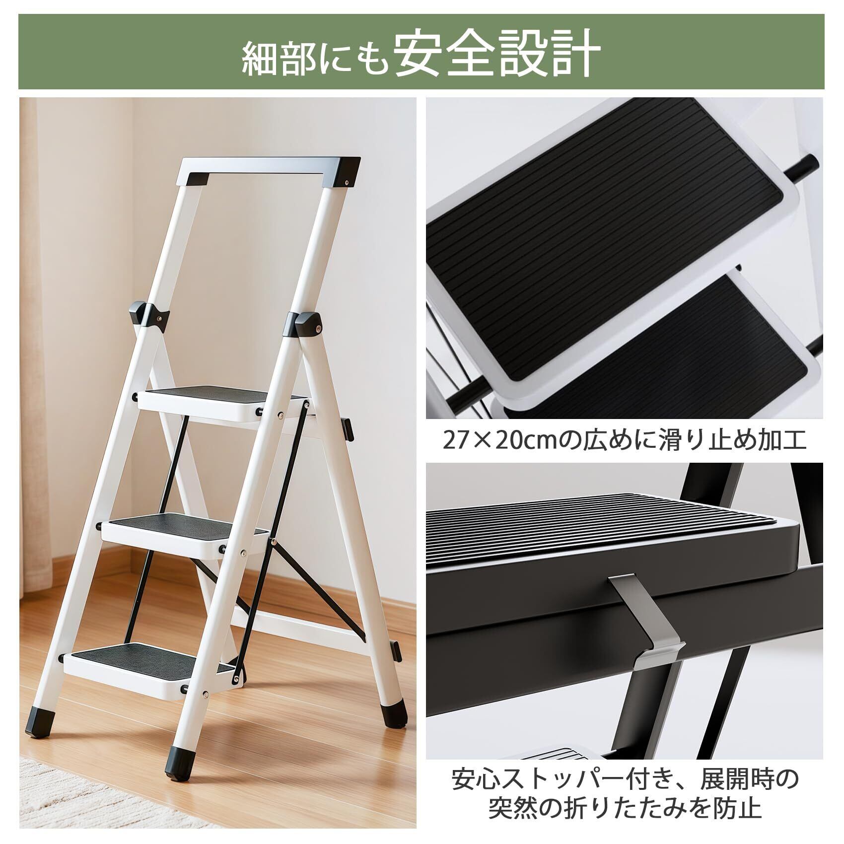 【安全設計で高所作業も安心】27×17cmの広めステップに滑り止め加工を施し、手すり付き設計でバランスを崩しやすい天井作業時も安心です。脚部には厚さ5mmの非滑りゴムキャップを採用し、タイル床や屋外の凹凸地面でもぐらつきません。安全ロック機構で展開時の突然の折りたたみを完全防止します。