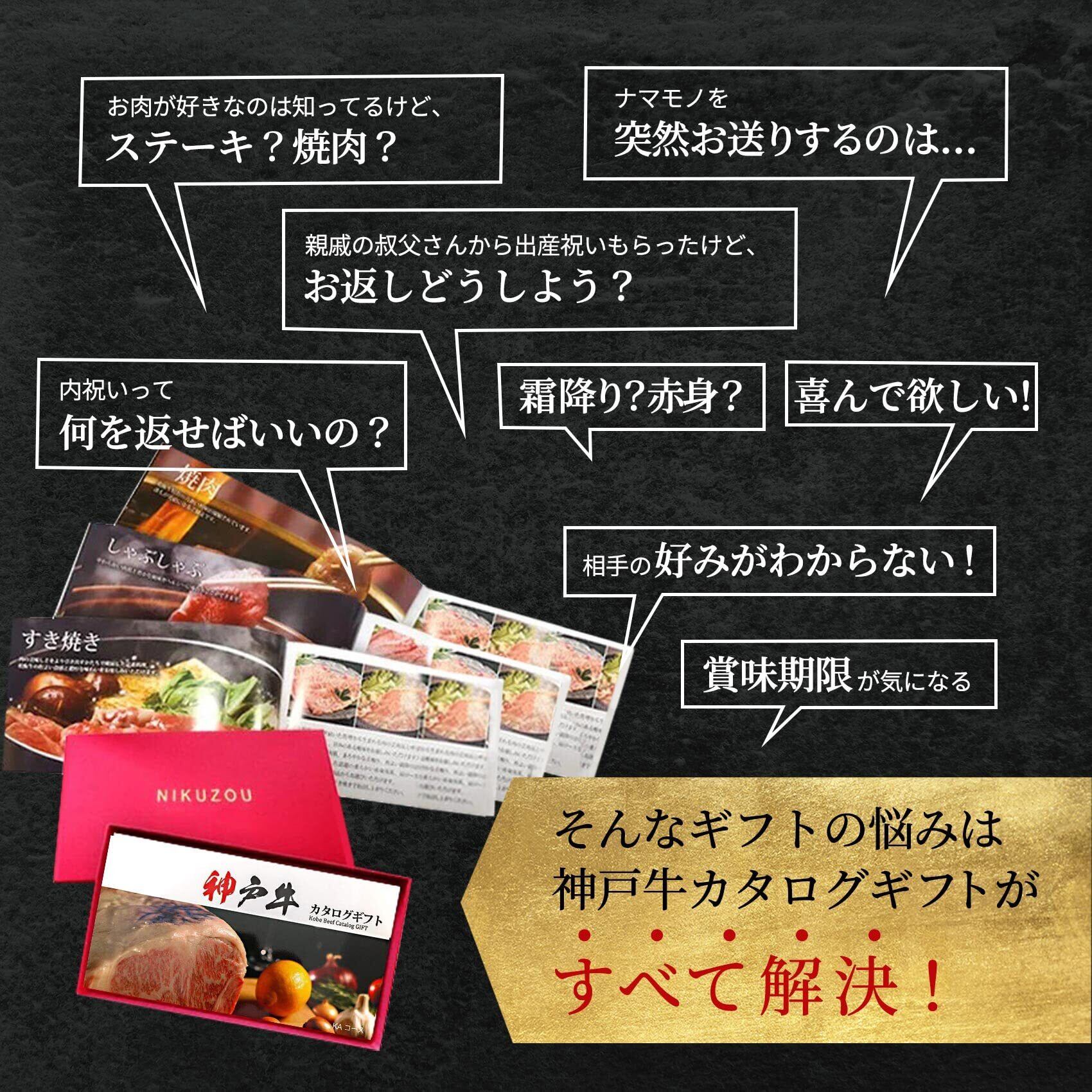 「このカタログには、すき焼き、しゃぶしゃぶ、焼肉、ステーキなど、受取人の好みに合わせて選べる魅力的なお肉が取り揃えられています。贈られた方は、自分の好みやシーンにぴったりなお肉を選ぶ楽しさを感じ、特別な瞬間を共有する素敵な機会を得られます。美味しい神戸牛を楽しむことができる贈り物として、自信を持ってお勧めいたします。」