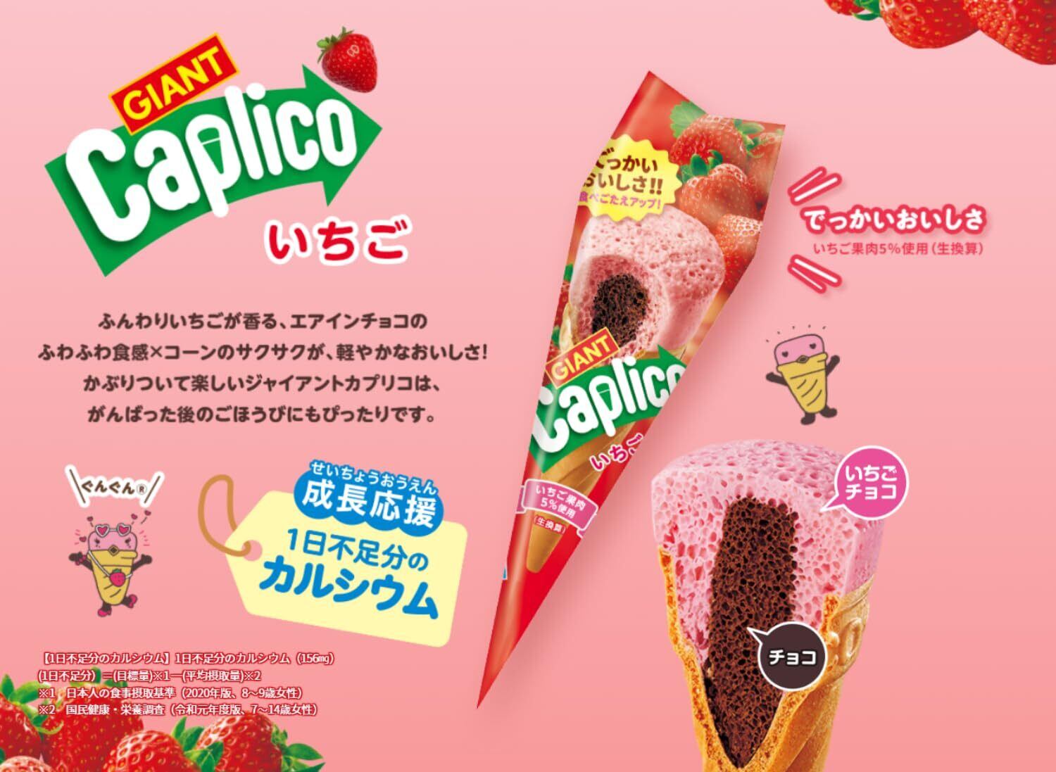 「『ジャイアントカプリコ いちご』は、エアインチョコで包まれた、ふわっと軽やかな食感が楽しめるお菓子です。甘酸っぱいいちごの風味が口いっぱいに広がり、何度でも食べたくなる美味しさ!大人から子どもまで楽しめる、心躍るおやつタイムにぴったりです。」