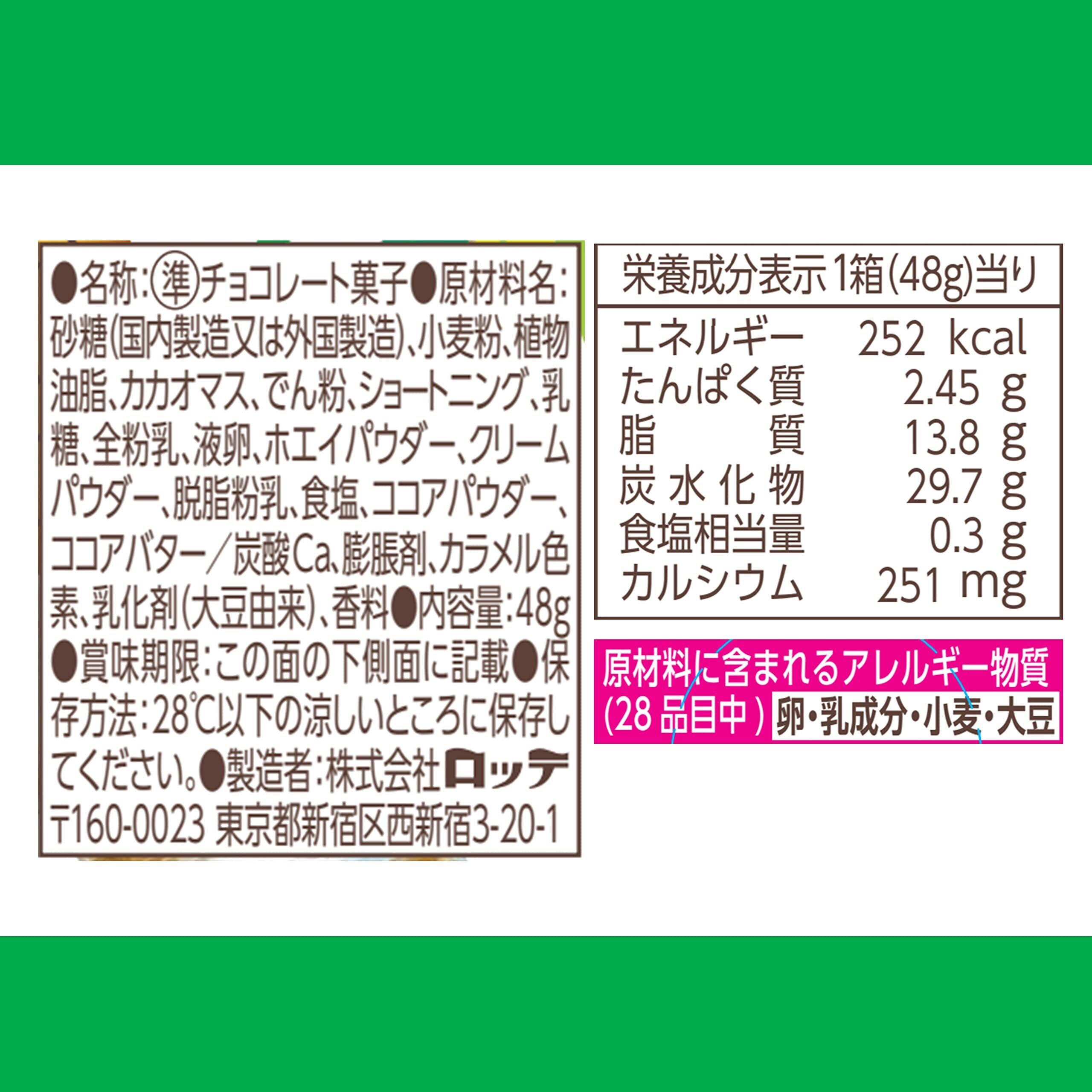 原材料:砂糖(国内製造又は外国製造)、小麦粉、植物油脂、カカオマス、でん粉、ショートニング、乳糖、全粉乳、液卵、ホエイパウダー、クリームパウダー、脱脂粉乳、食塩、ココアパウダー、ココアバター/炭酸Ca、膨脹剤、カラメル色素、乳化剤(大豆由来)、香料