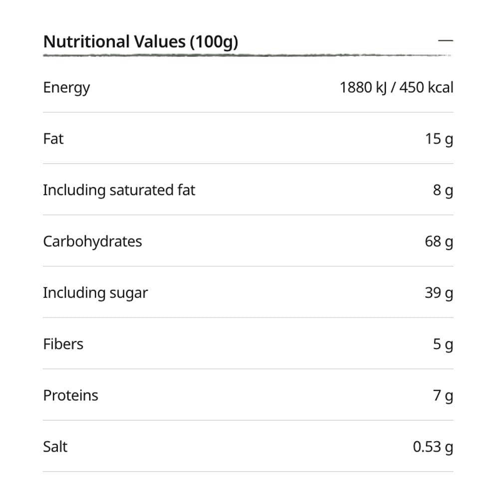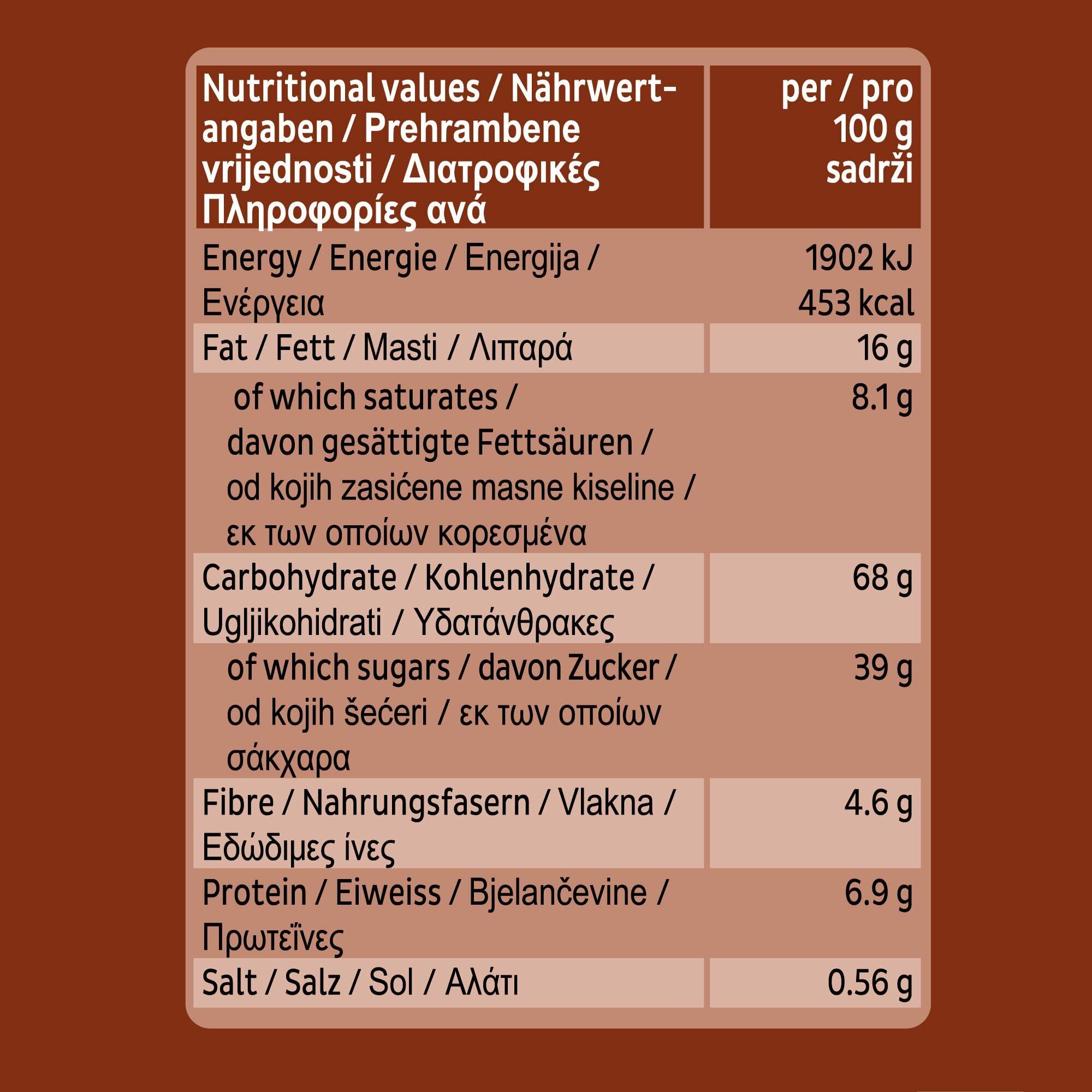 チョコレートクリームフィリング(砂糖、植物油脂、へーゼルナッツ、ココアパウダー、カカオマス、脱脂粉乳、ココアバター)、米粉、全粒小麦、粗糖、脱脂粉乳、小麦ふすま、ココアパウダー、食塩、マルトデキストリン、乳化剤(大豆由来)、香料、V.E,ナイアシン、パントテン酸Ca,V.B6,V.B2,V.B1,葉酸、V.B12