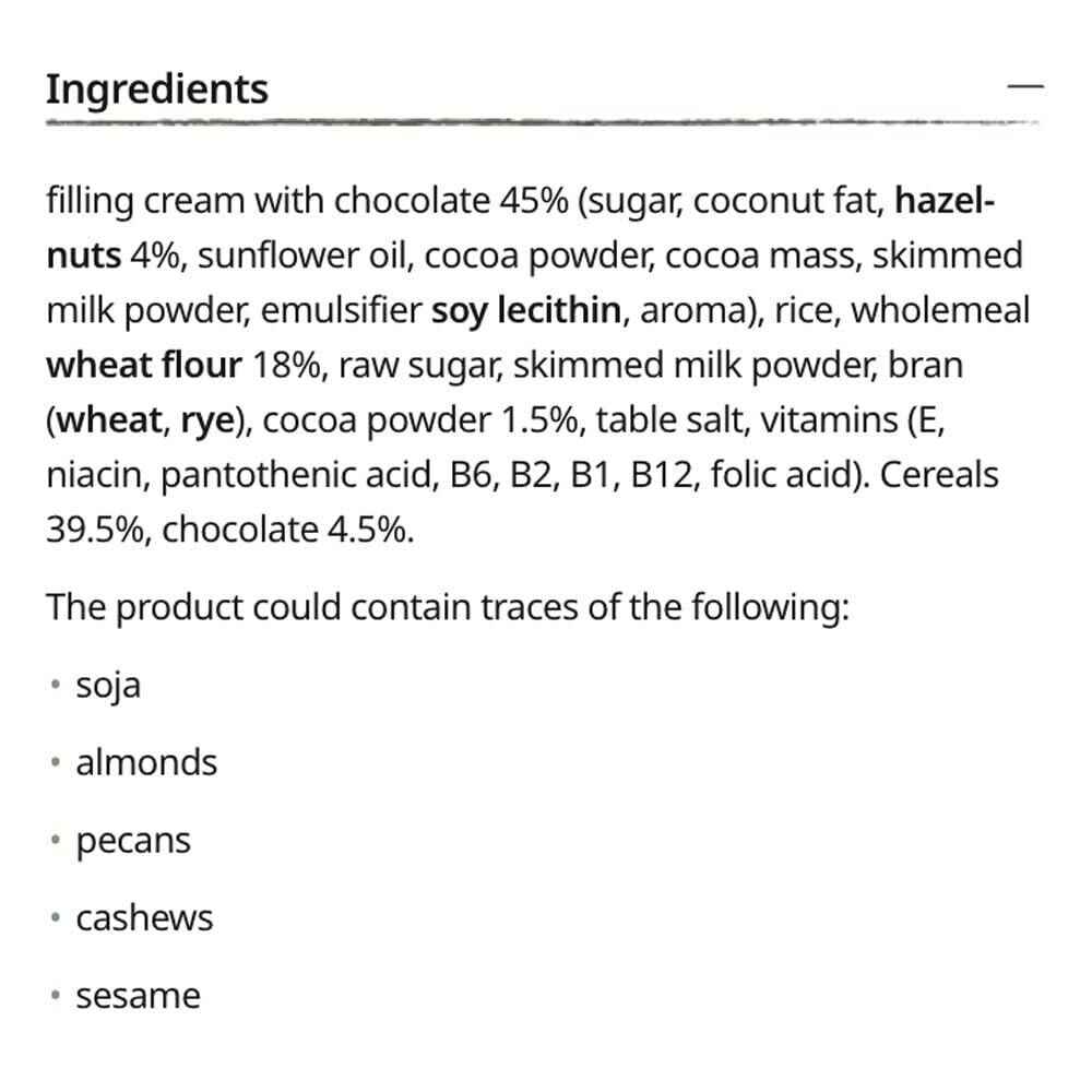 原材料:チョコレートクリームフィリング(砂糖、植物油脂、へーゼルナッツ、ココアパウダー、カカオマス、脱脂粉乳、ココアバター)、米粉、全粒小麦、粗糖、脱脂粉乳、小麦ふすま、ココアパウダー、食塩、マルトデキストリン、乳化剤(大豆由来)、香料、V.E,ナイアシン、パントテン酸Ca,V.B6,V.B2,V.B1,葉酸、V.B12