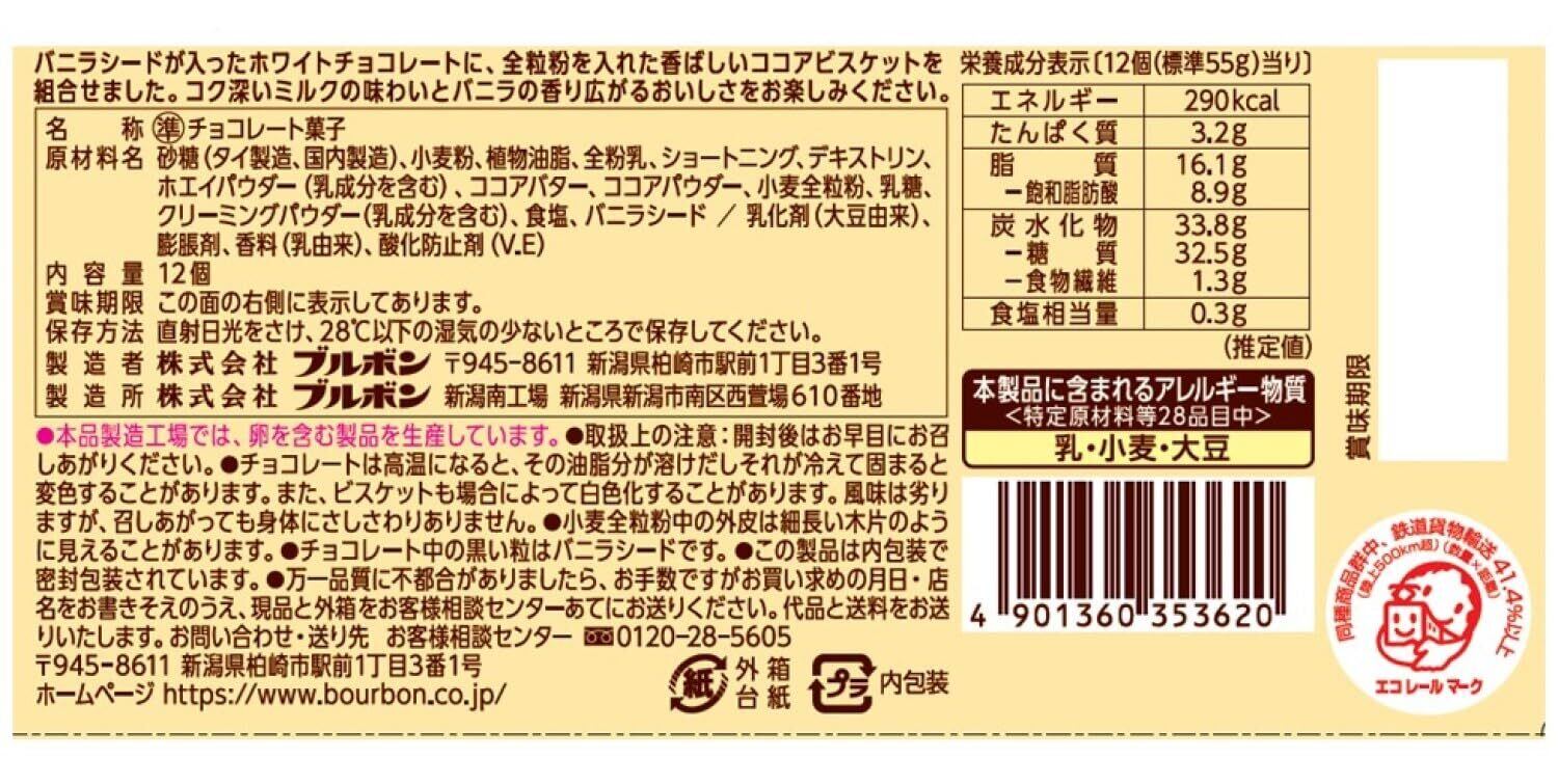 原材料:砂糖(タイ製造、国内製造)、小麦粉、植物油脂、全粉乳、ショートニング、デキストリン、ホエイパウダー(乳成分を含む)、ココアバター、ココアパウダー、小麦全粒粉、乳糖、クリーミングパウダー(乳成分を含む)、食塩、バニラシード/乳化剤(大豆由来)、膨張剤、香料(乳由来)、酸化防止剤(V.E)