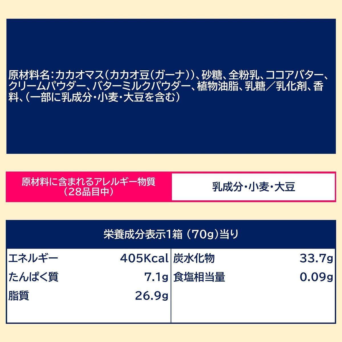 原材料:カカオマス(カカオ豆(ガーナ))、砂糖、全粉乳、ココアバター、クリームパウダー、バターミルクパウダー 、植物油脂、塩シーズニング、乳糖/乳化剤、香料、(一部に乳成分・小麦・大豆を含む)