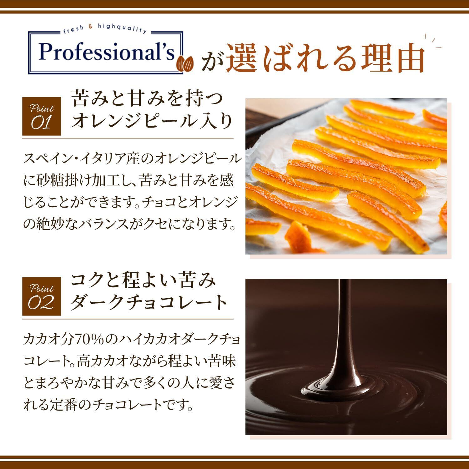 「『【Professional's】ダークチョコレート オレンジピール入り』は、厳選された原材料を使用しており、安全にお楽しみいただけます。濃厚なビターチョコレートとオレンジピールの組み合わせが、特別なスイーツタイムを演出します。大切な方へのプレゼントにも喜ばれる一品です。」