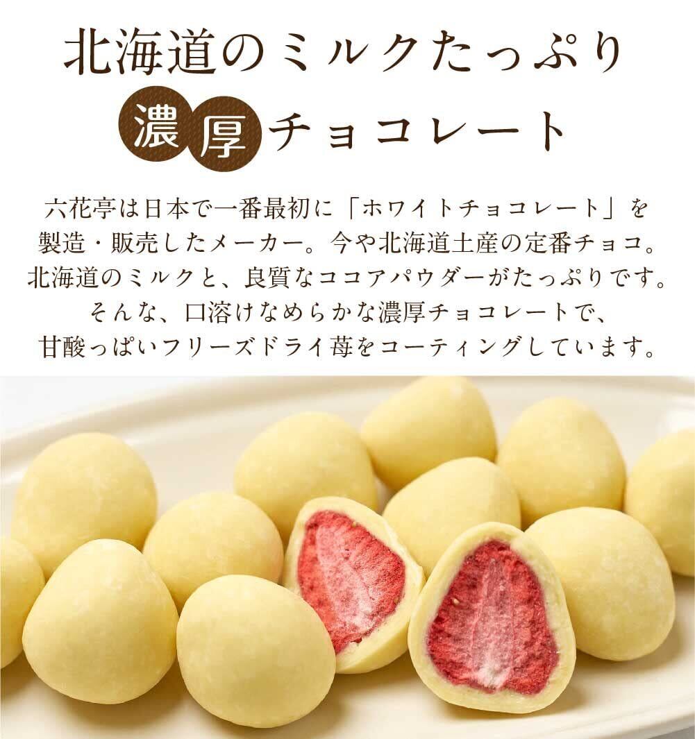 「『六花亭 ストロベリーチョコ ホワイト』は、高品質な苺とホワイトチョコレートを使用しており、誰でも安心してお楽しみいただけます。特別な日の贈り物や、自分へのご褒美に最適なアイテムです。心を込めた甘さが、ほっとするひと時を演出します。」