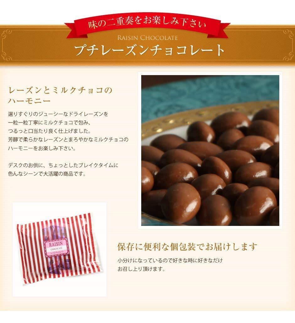 「このプチレーズンチョコレートは、友人や家族との楽しいひと時を過ごすための最適なお菓子です。個包装で手軽にシェアできるため、パーティーや贈り物にも喜ばれること間違いなし!甘酸っぱいレーズンの味わいが、皆様の笑顔を引き出す特別なおやつとなることでしょう。」