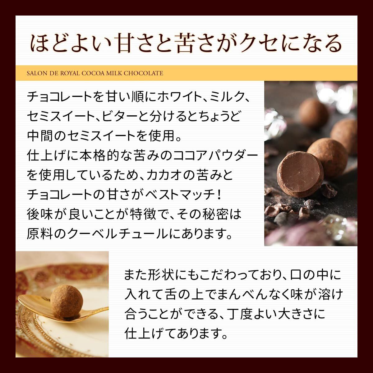 「『サロンドロワイヤル ココアミルクチョコレート』は、厳選された素材を使用しており、誰にでも安心してお楽しみいただけます。特別な日の贈り物や、ご自身へのご褒美にもぴったりのアイテムです。心を込めたこだわりの味わいが、ほっとする瞬間を演出します。」