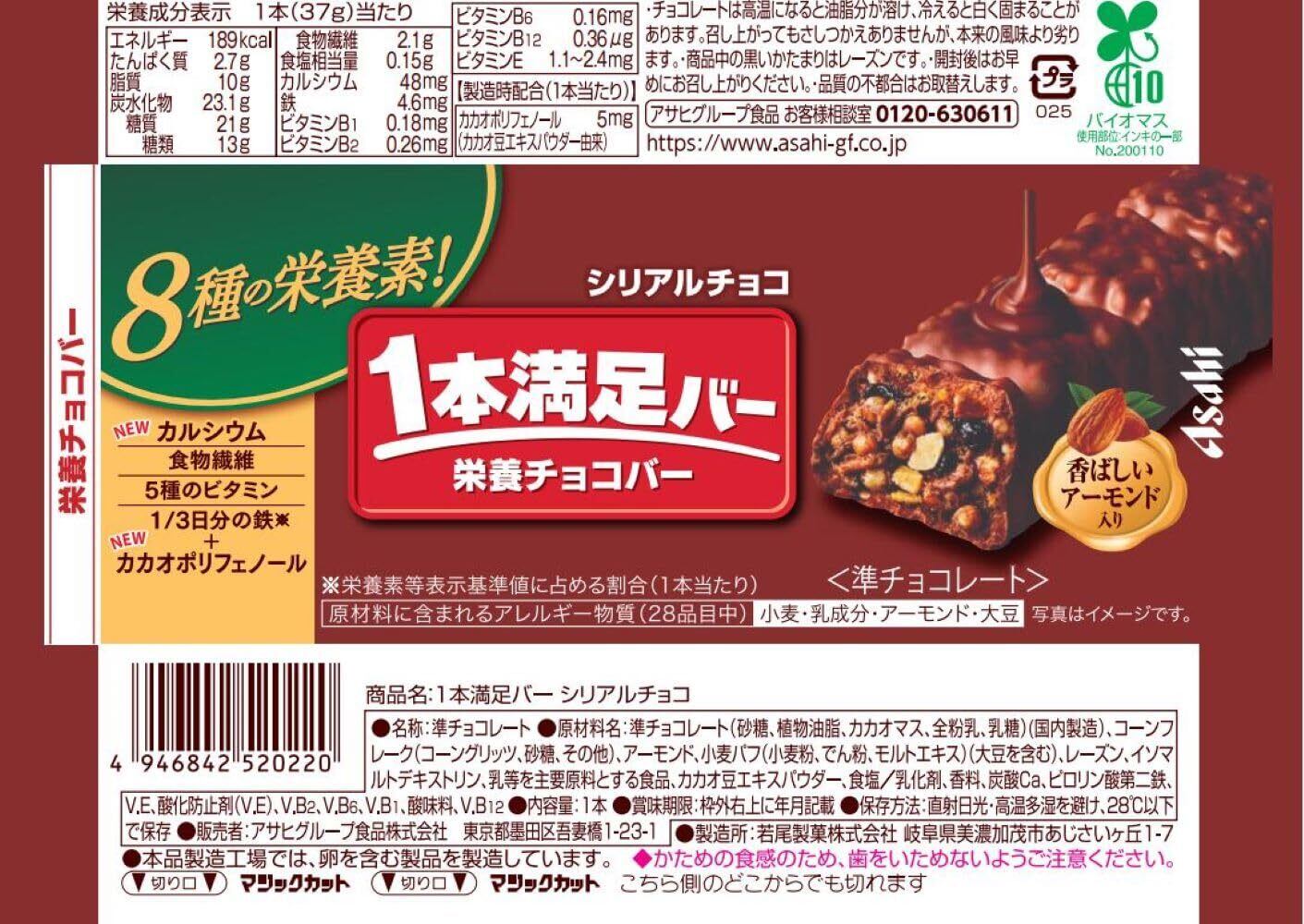 「『アサヒグループ食品 1本満足バー シリアルチョコ』は、美味しさと栄養を兼ね備えた理想的なおやつです。しっとりとしたチョコレートが、サクサクのシリアルと絶妙に絡み合い、ひと口で満足感を得られます。特に忙しい日々の中で、手軽にエネルギー補給をしたい方にぴったりなアイテムです!」