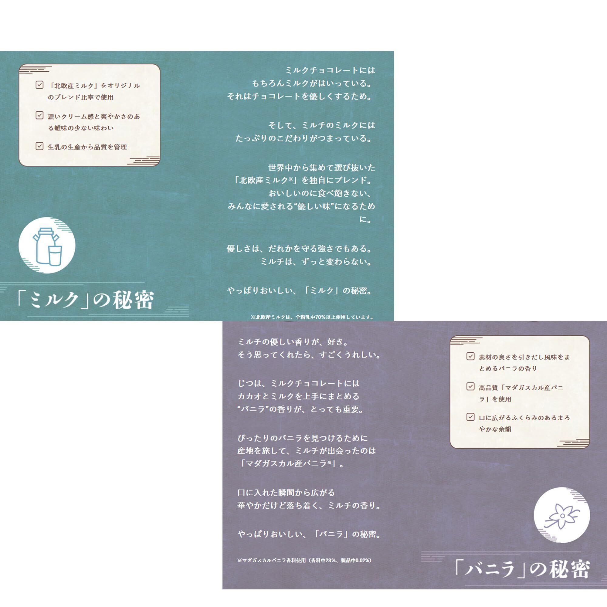 ●ハイミルクチョコレート~『明治ミルクチョコレート』よりも濃厚なミルク感を楽しめるミルクリッチなチョコレート。上質な素材を使って、ミルク本来の香りとコクにこだわったチョコレートです。