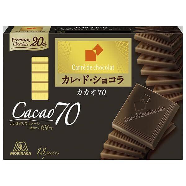 「『森永製菓 カレ・ド・ショコラ <カカオ70>』は、カカオ70%のリッチな風味を楽しめるチョコレートです。一口サイズでつまみやすく、口の中で広がる豊かなカカオの味わいが特別なひとときを演出します。気軽なおやつやデザートとして、またお茶うけにもぴったりな一品です!」