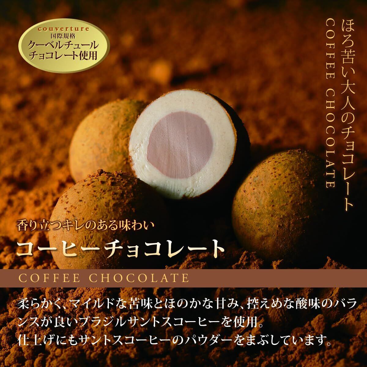 【素材のこだわり】ミルクチョコレートをモカコーヒーチョコレートで包み、コーヒーパウダーをまぶしました。まろやかながらもキレのある豊かな味わいが楽しめます。 コーヒーの香りとチョコの甘味が織りなす美味しさは男性にも好評