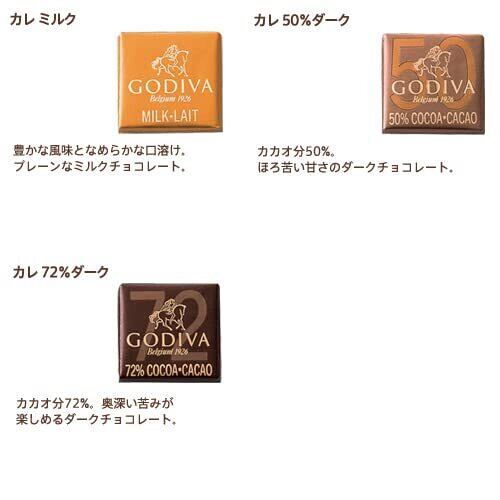 ゴディバのチョコレートへのこだわりが際立つ、薄いスクエアタイプのチョコレート、カレのアソートメントが装い新たに登場。美しいカカオを描いたパッケージに、カカオを存分に堪能できるミルク、カカオ50%ダーク、カカオ72%ダークの3種類のカレを詰め合わせました。ご自分用に、気軽な贈り物に。
