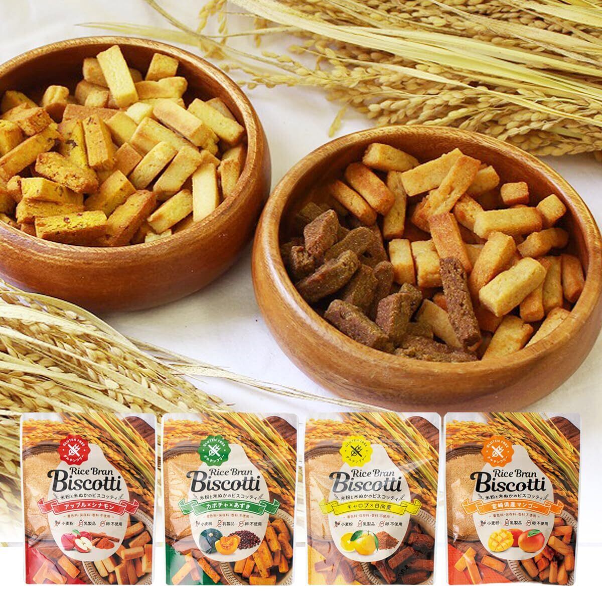 「『米粉クッキー グルテンフリー ライスブランビスコッティ』は、グルテンフリーの米粉を使用した、体に優しいお菓子です。4種類のフレーバー(キャロブ日向夏、アップルシナモン、かぼちゃあずき、マンゴー)が楽しめる40gのパッケージは、どんなシーンにもぴったりのスナックです!」