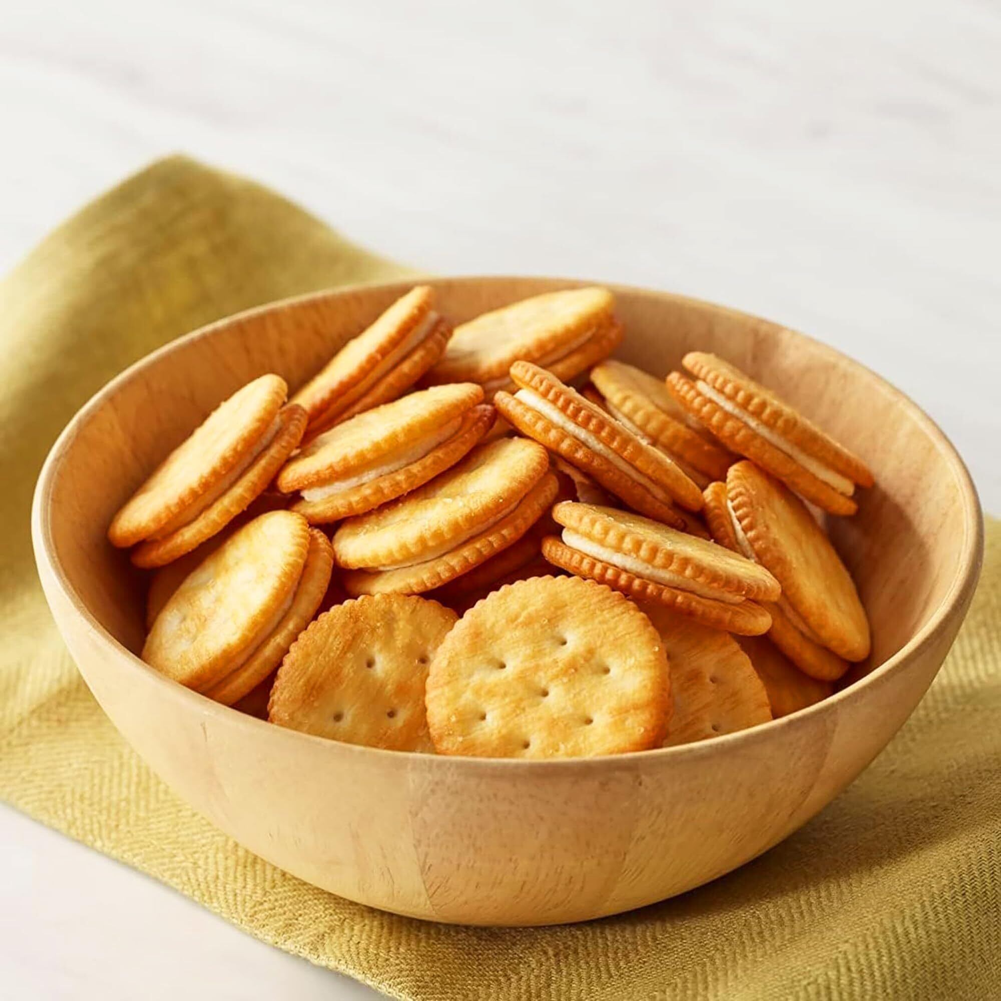 「このリッツは、サクサクとした食感のクラッカーと、濃厚なチーズのクリームが絶妙に組み合わさっています。一口ごとに広がる風味は、どなたでも楽しめる魅力的なおやつです。お子様から大人まで、人気のおやつとしてリビングの一角やピクニックにもお役立ていただけます!」