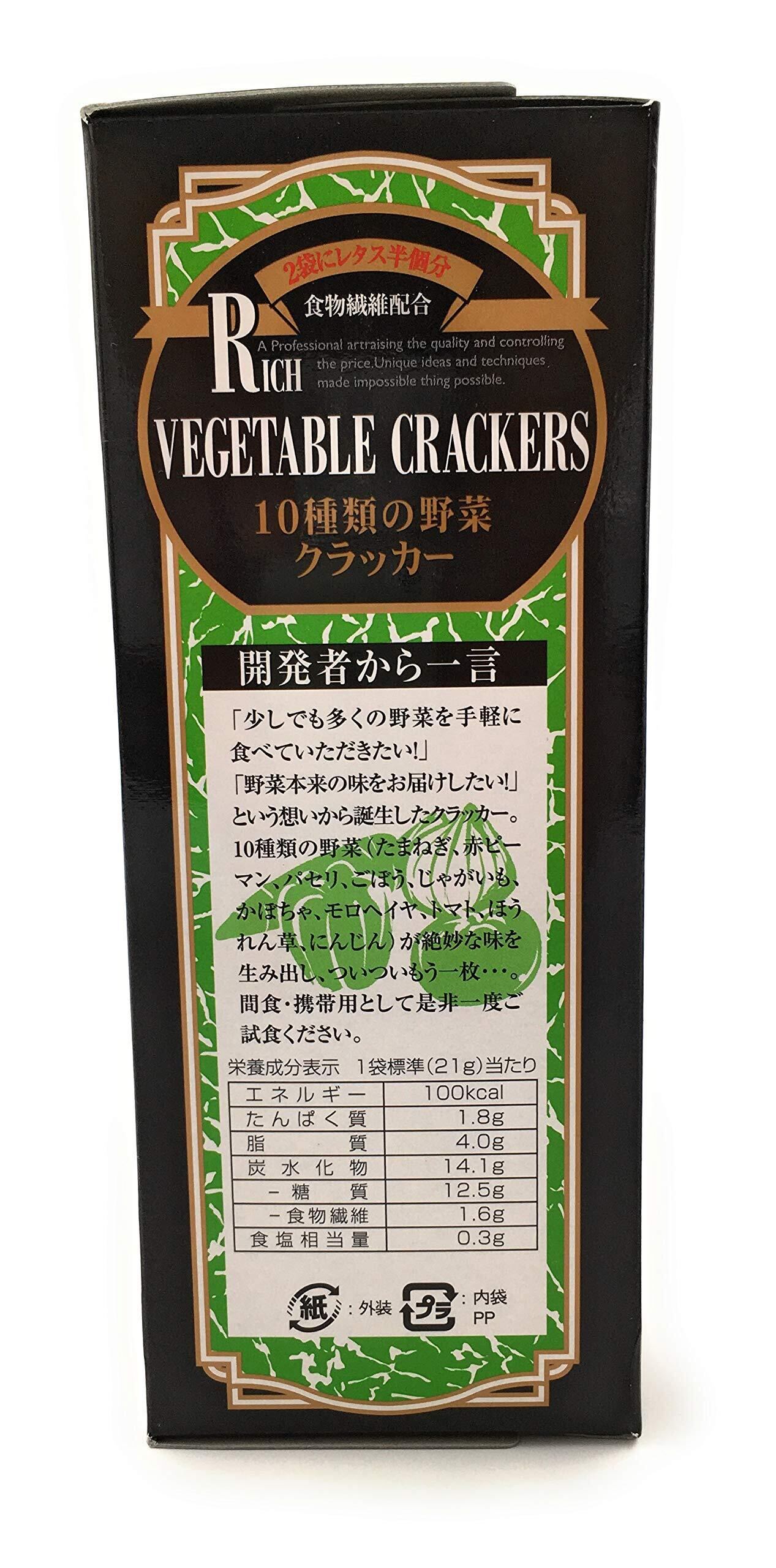 「このクラッカーは、トマト、ほうれん草、かぼちゃなど、10種類の野菜を使用しており、栄養価が高く、体にも優しい一品です。サクサクとした食感と野菜本来の風味がマッチし、軽食やおやつにぴったりです。お子様から大人まで、どなたでも楽しむことができます!」